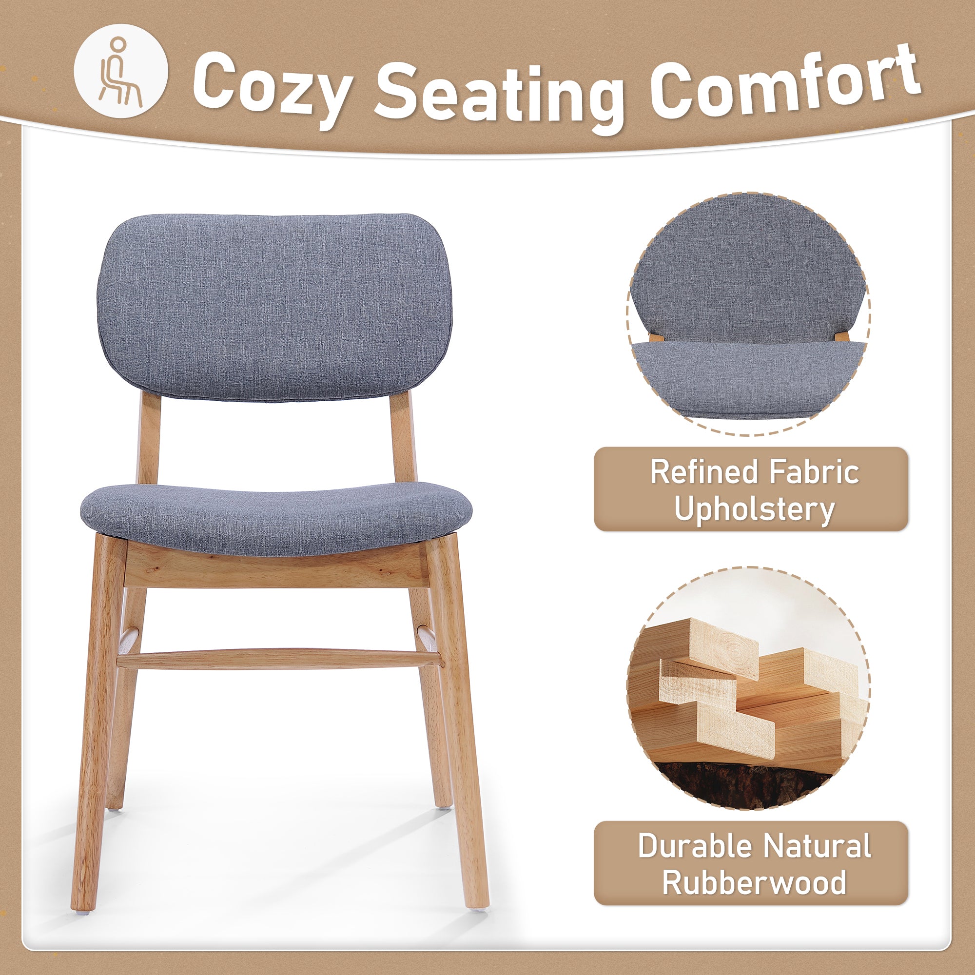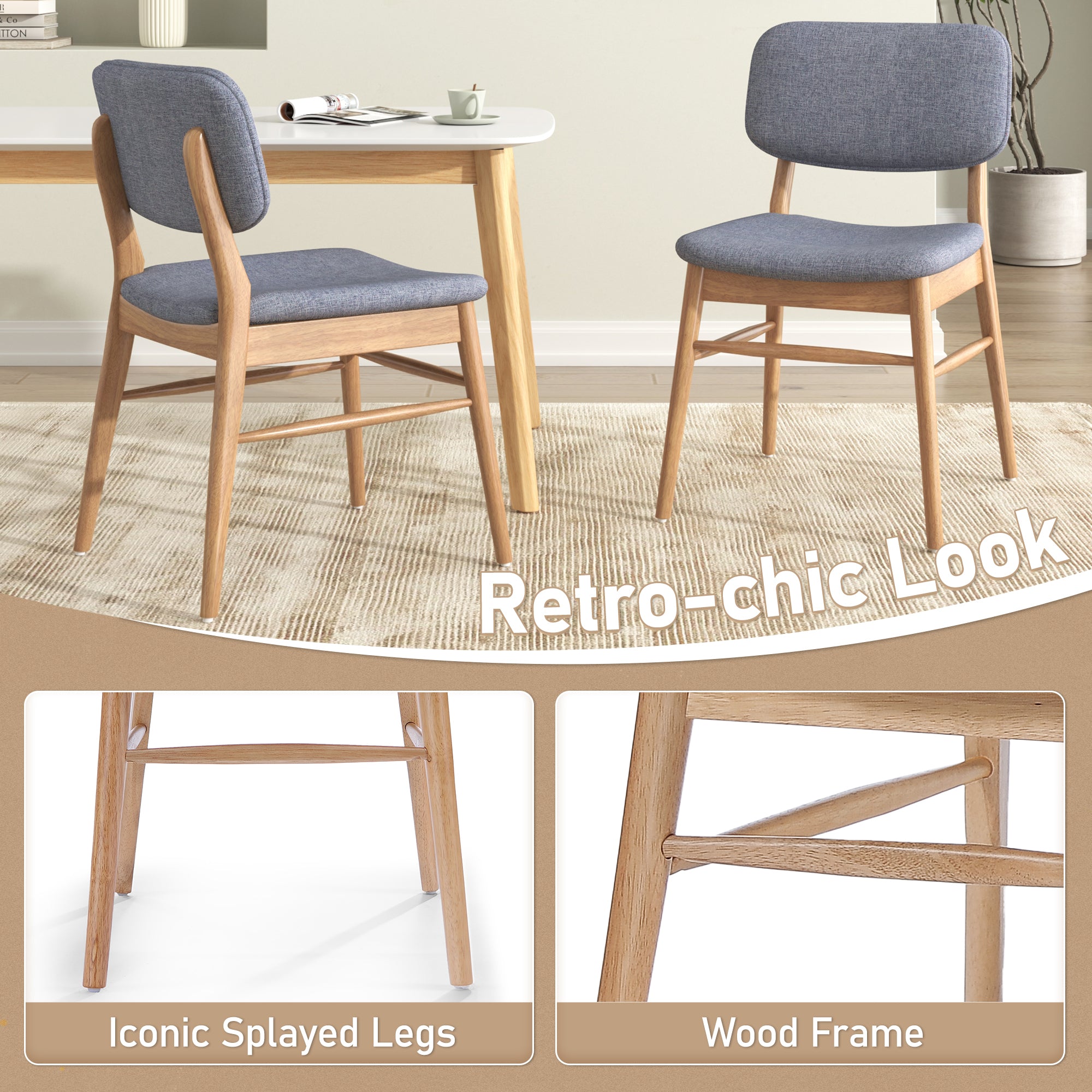 1. Mid - century design charm 2. Upholstered for comfort 3. Durable rubberwood frame 4. Ideal size for spaces 5. Easy assembly included 6. Set of two chairs