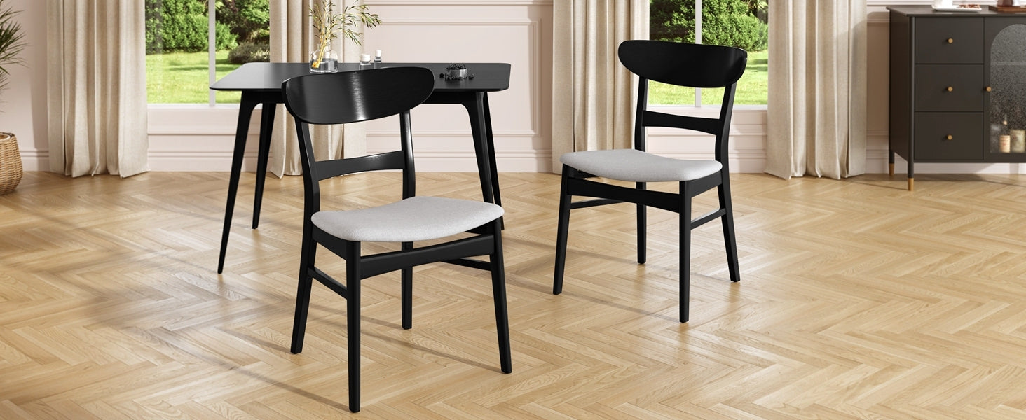 1. Mid - century unified design 2. Rubberwood frame (table + chairs) 3. Upholstered chairs for comfort 4. Low - upkeep faux wood tabletop 5. Ideal dining space dimensions 6. Reliable weight capacities(Table: 250 lbs; Chair: 220 lbs) 7. Easy assembly included
