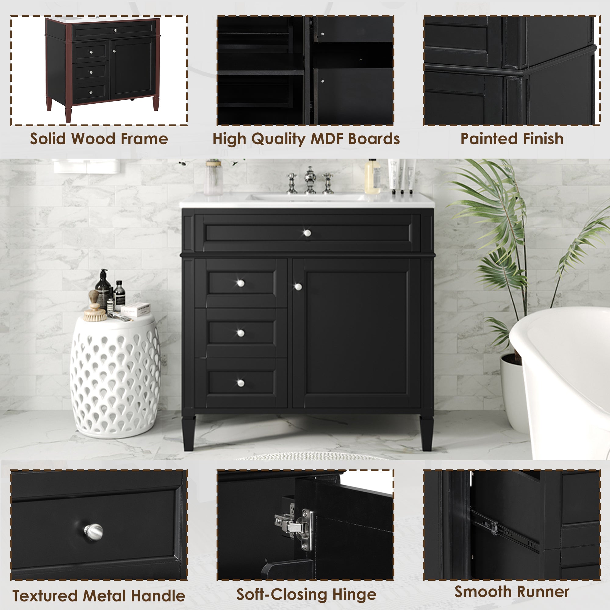 - [ Multi-Purpose Cabinet & Concealed Storage ] Are you looking for stylish and functional storage solutions for your bathroom? Our bathroom vanity provide ample space for all your toiletries and bathroom essentials. The combination of the cabinet body and the drawer perfectly stores all kinds of bathroom products and keeps the necessities away from water stains and dust. Soft-close doors and drawer fronts feature a water-resistant paint finish for durability.