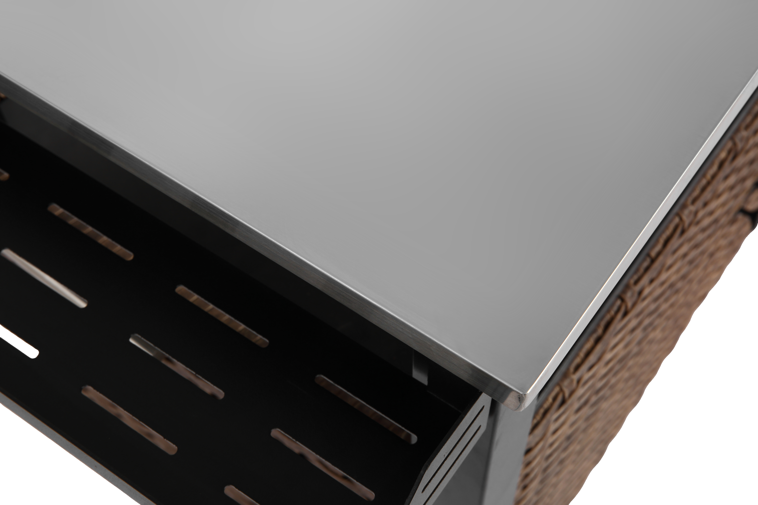This rattan outdoor kitchen table features a solid steel frame that's covered in weather-resistant handwoven wicker; Stainless steel countertops are better for outdoor use; Can withstand diverse weather conditions to achieve long-lasting use