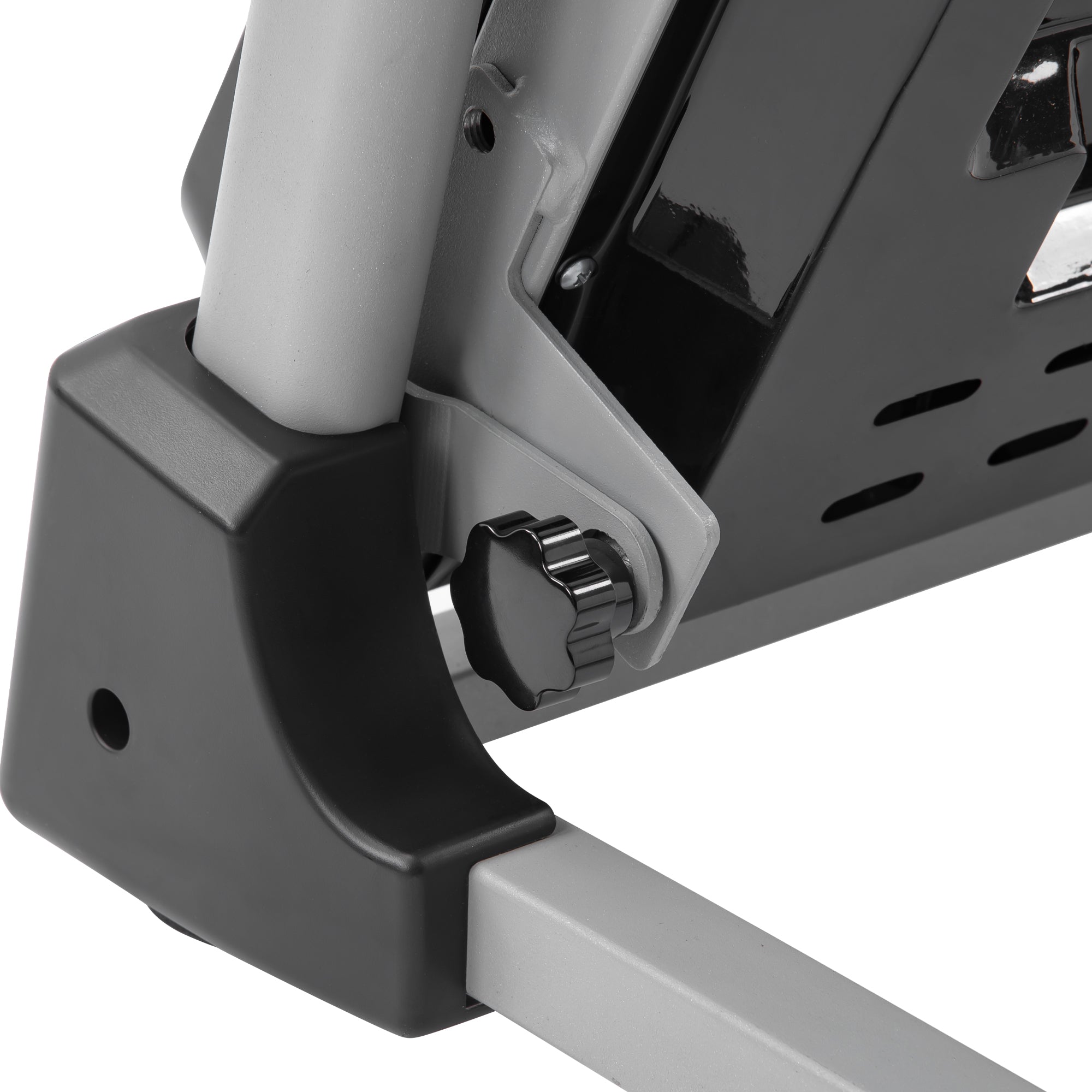 This stable and durable treadmill provides everything you need for your daily exercise. Holds 300 pounds. The sturdy structure is equipped with a 2.5HP motor to ensure satisfactory training performance. We have preset 12 built-in running programs for this treadmill, or you can choose the rhythm you want within the range of 0.5-7.5MPH as you like. The running board is 3-level manually adjustable to meet your personal experience. You can shut down this running machine immediately with the safety key on the control panel to avoid accidental injury. The standard LED display provides intuitive feedback of time, distance, speed, calories, and heart rate, so you can monitor your exercise status. Both armrests have integrated hand pulse sensors to provide synchronous monitoring of critical heart rate data. The excellent shock absorption effect of this treadmill comes from a multi-layer synthetic running belt and a reasonably structured running board, which keeps you away from common running sports damage and protects your knees, hips, ankles, and feet. The quiet belt drive system reduces noise interference while providing performance. Two bottle cages on the panel make water replenishment within easy reach and are equipped with a device stand for your smart device and built-in speakers to help relax while running. Easy to store and set up. Assembly size: 51' x 24.5' x 44.5'. Folded size: 26' x 24.5' x 47'. This compact treadmill brings outdoor activities into your house, it's a great choice for exercising indoors and providing a reasonable way to reach or maintain your workout goals. This treadmill has a compact design and a small footprint. Its easy-to-store folding mechanism design is very suitable for small apartments or home gyms, allowing users to choose to fold it up quickly, so as not to save valuable space in your home when needed.