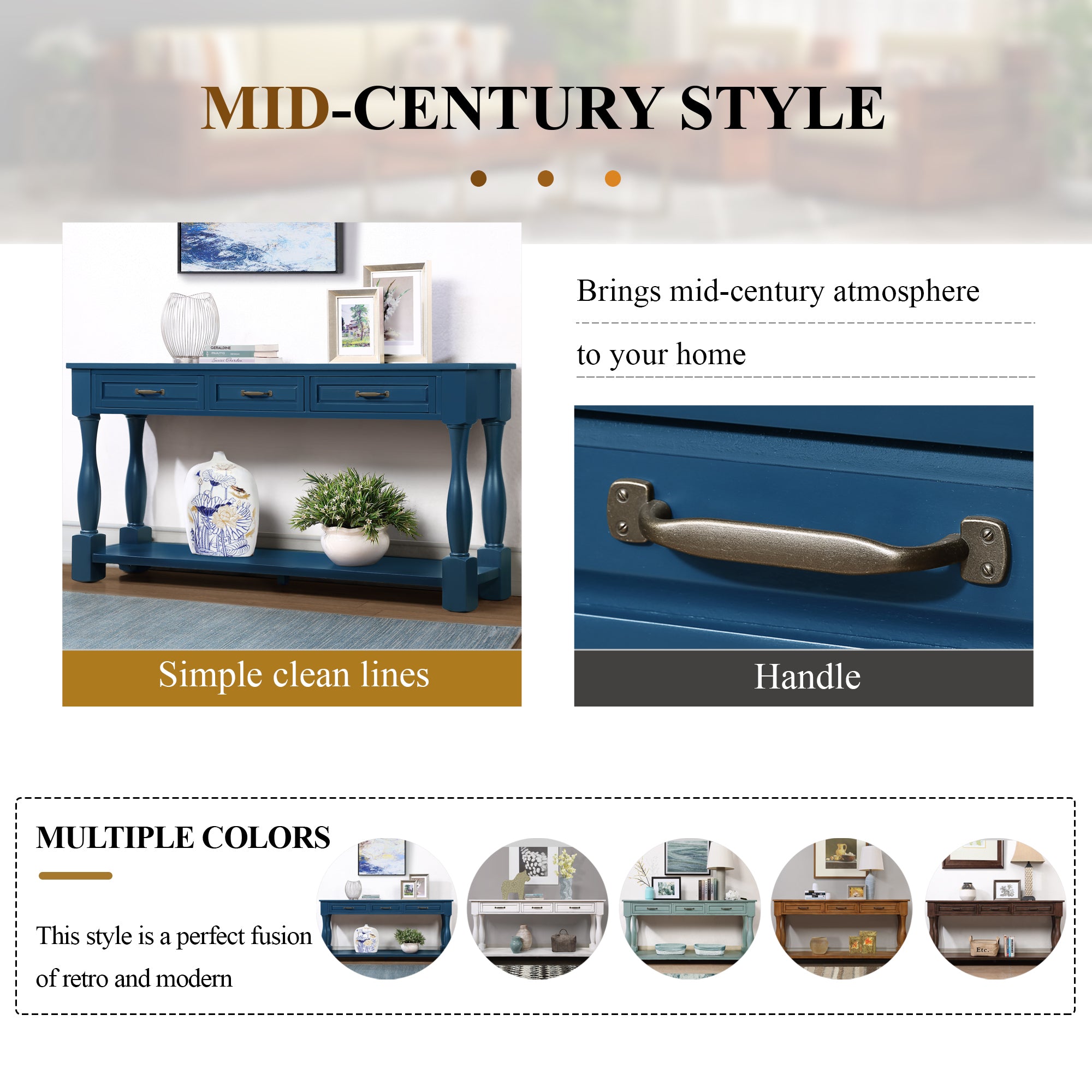 the whole console table and all details including handle and finish are aim to bring mid-century style to your home.