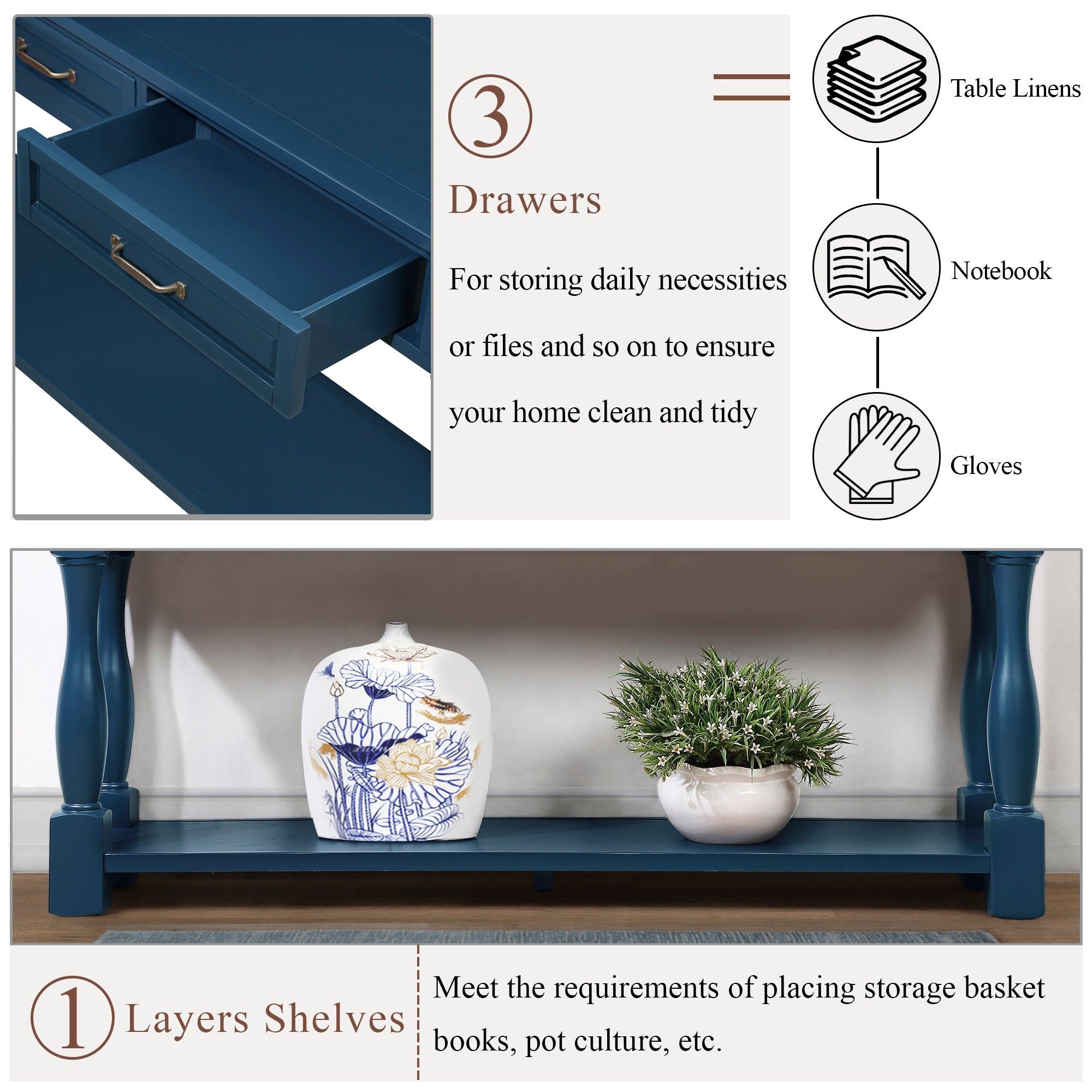- [Multi Functional Storage Space] The sofa table features with total 3 functional drawers and a fixed lower shelf and long enough tabletop which provide enough storage space. This is a good place to put your daily necessities.