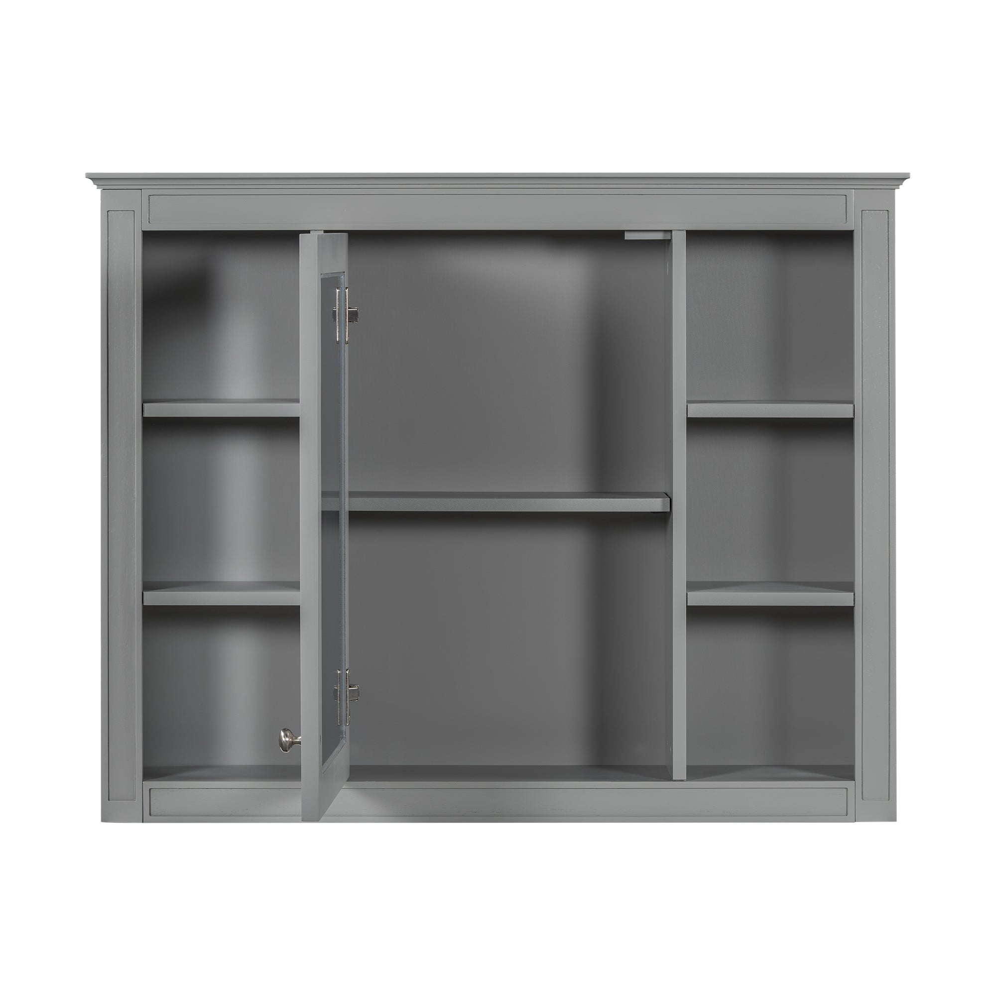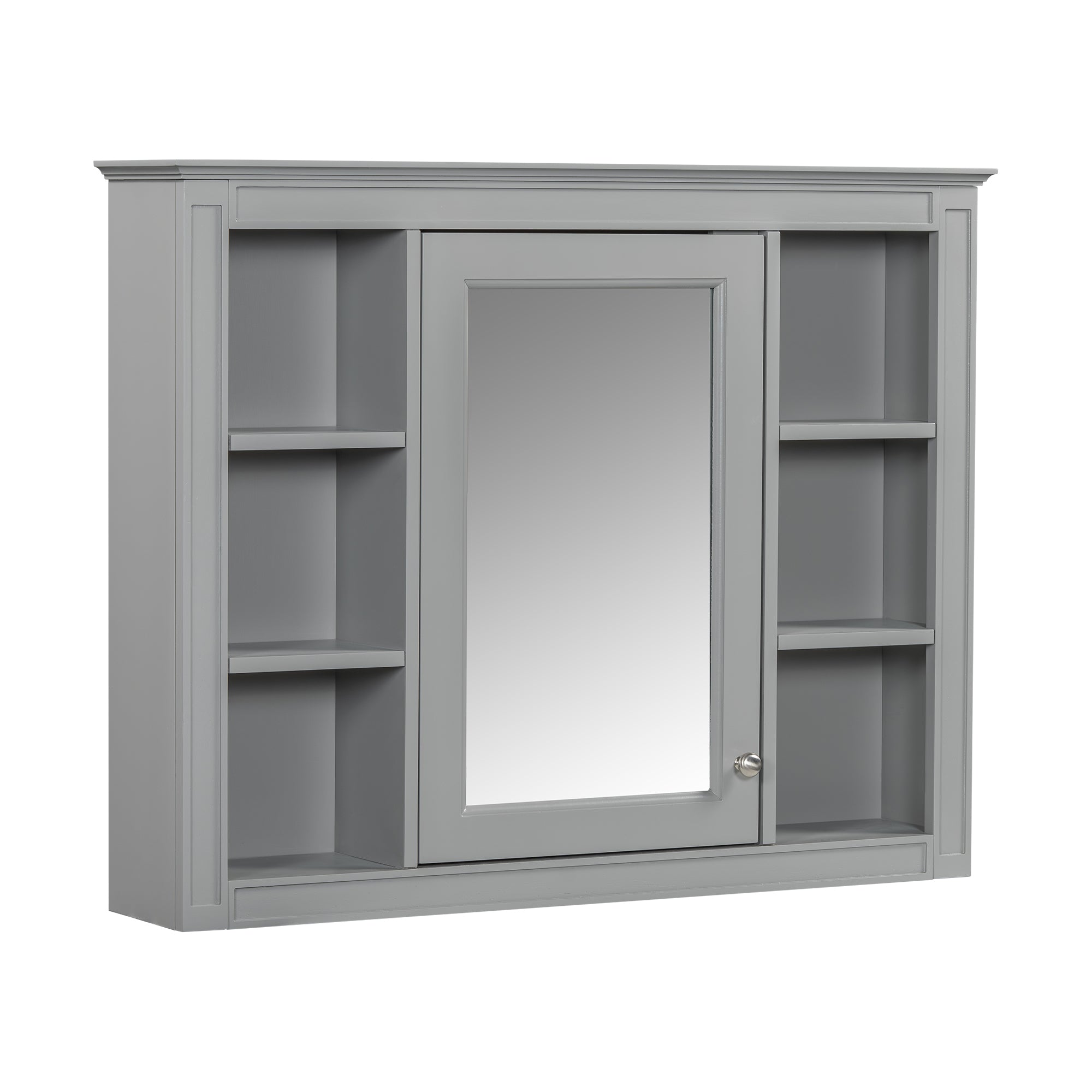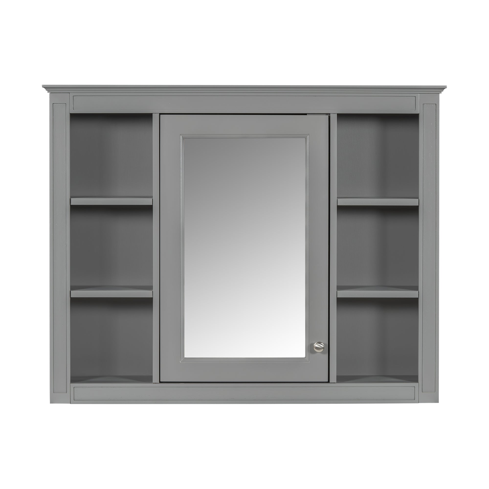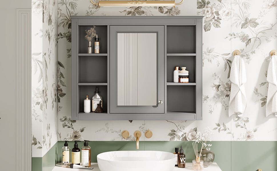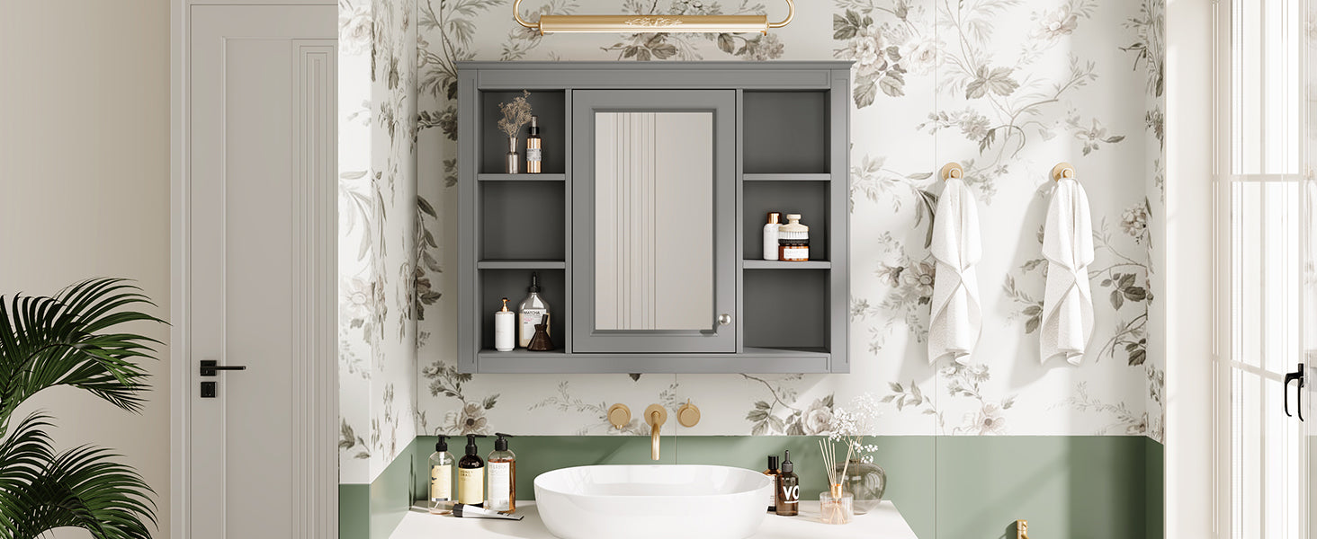 This wall-mounted mirror cabinet perfectly combines modern design with excellent functionality. It is made of high-quality MDF board, which is durable and environmentally friendly. The high-definition mirror provides clear reflections, making every use convenient and quick. The clever design combines hidden and open shelves to store personal items and keep the space tidy, while displaying commonly used items for easy access. Two built-in storage cabinets meet large-capacity storage needs and perfectly hide clutter. The three-layer adjustable storage board allows you to flexibly adjust the storage space according to your needs and adapt to the storage of different items. The included towel rod design allows you to easily hang towels or clothes, increasing the practicality and convenience of the bathroom. Whether it is the bathroom, bedroom or other space, this mirror cabinet can provide a neat, practical and beautiful storage solution to improve the quality of your home life.