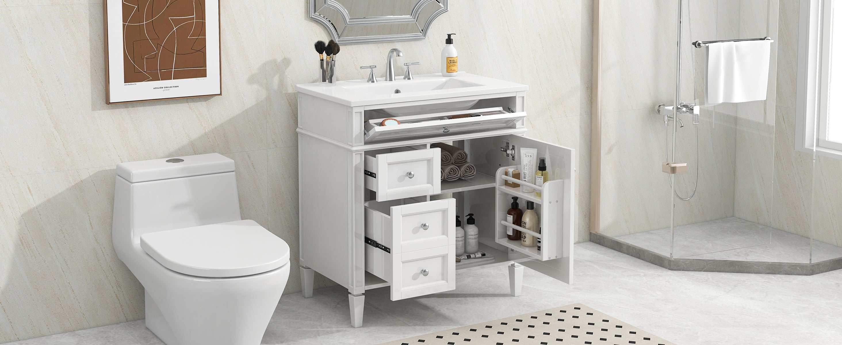 The cabinet design includes 3 drawers and a storage cabinet, providing abundant storage space to help you easily store bath towels, toiletries and other daily necessities. The drawer adopts a silent slide design, which opens and closes smoothly, greatly improving the user experience.
