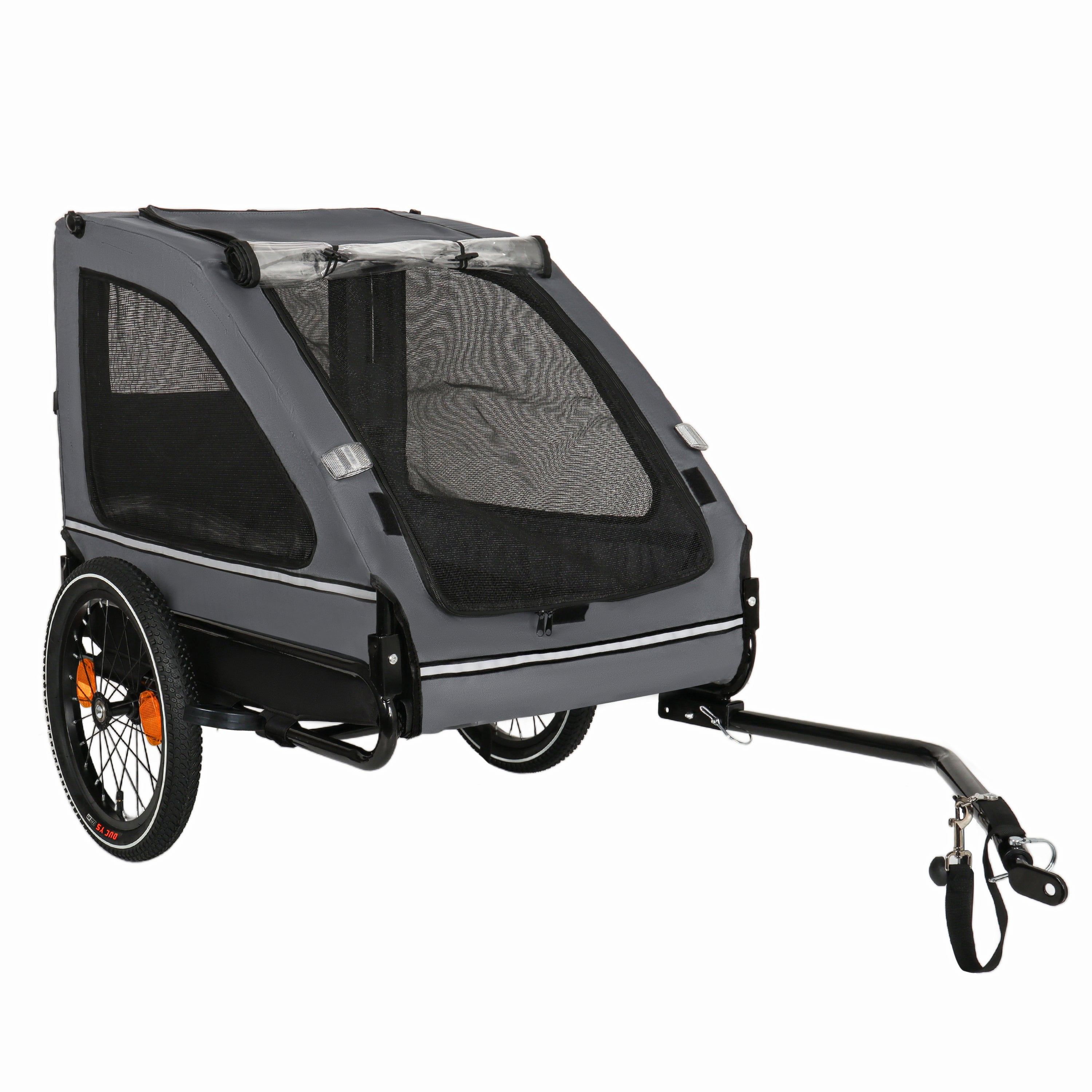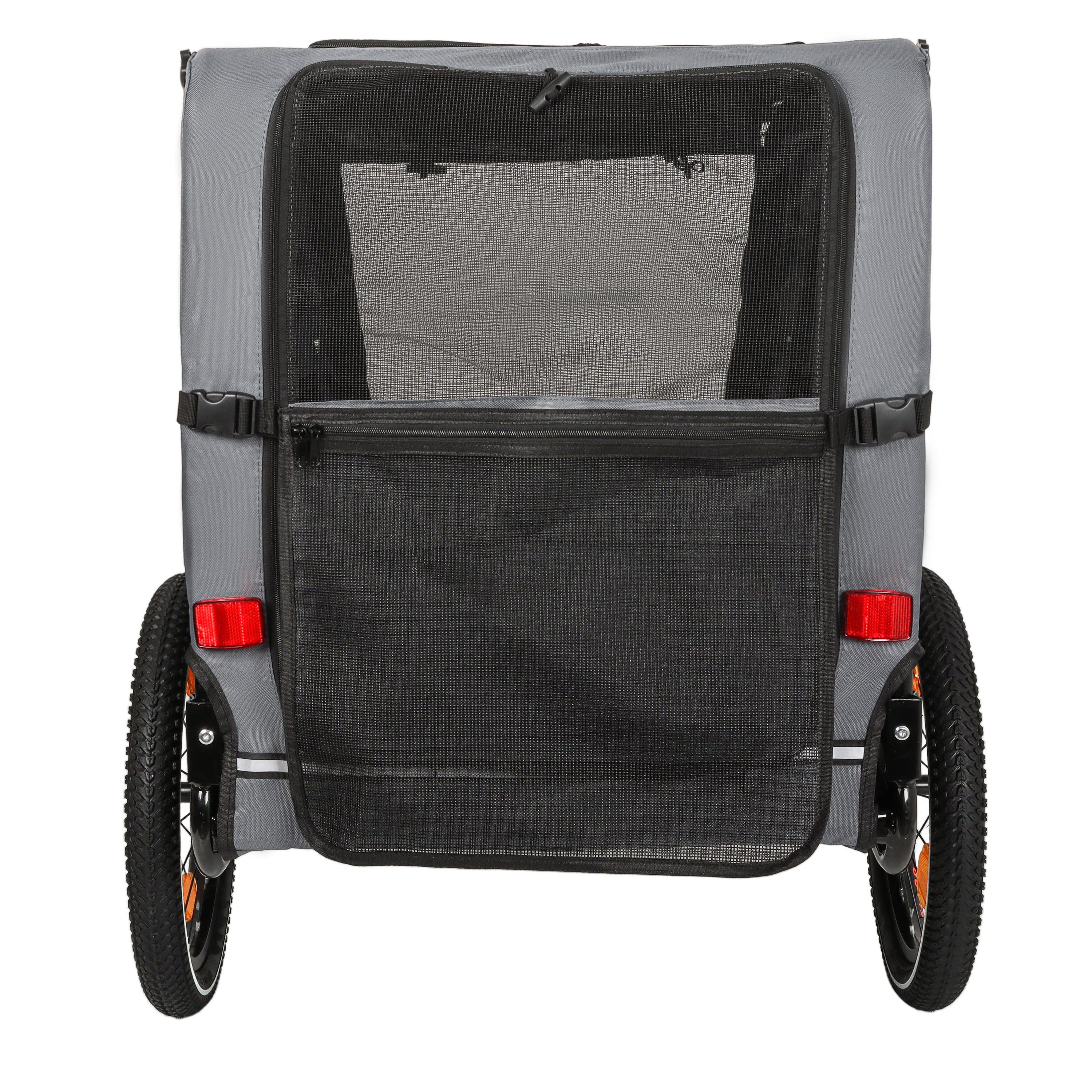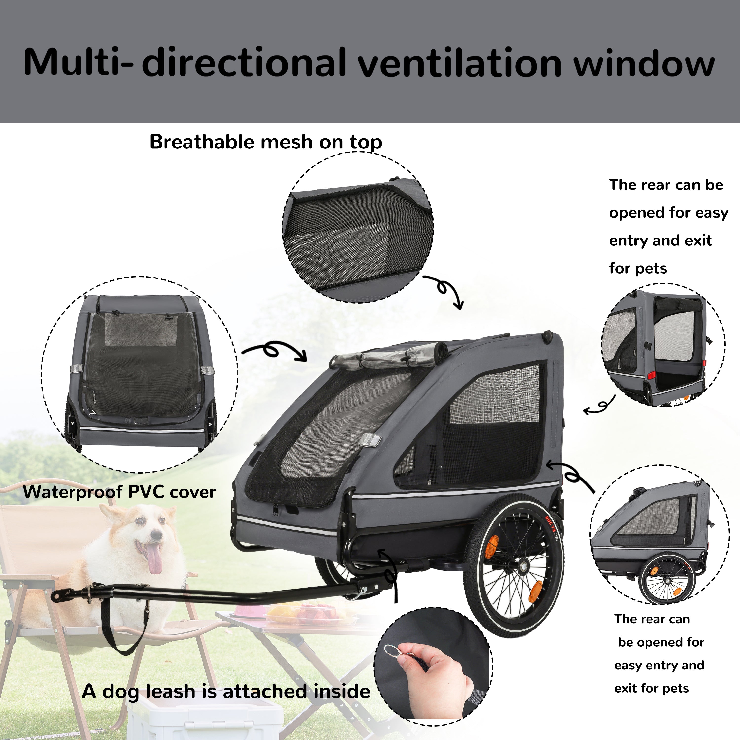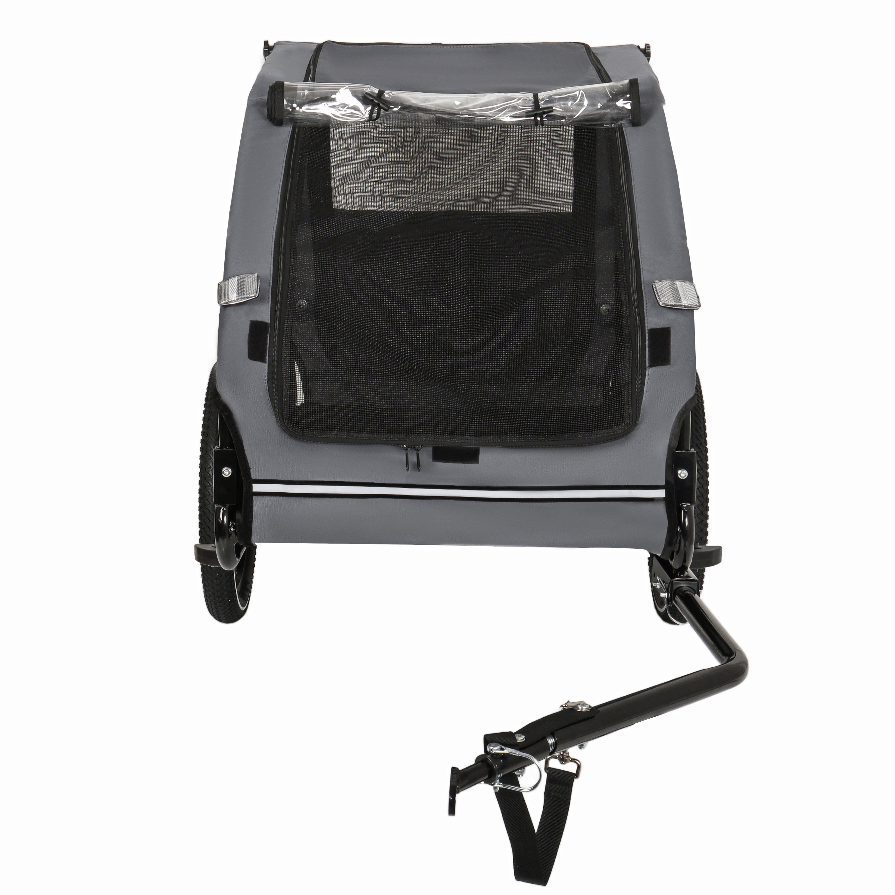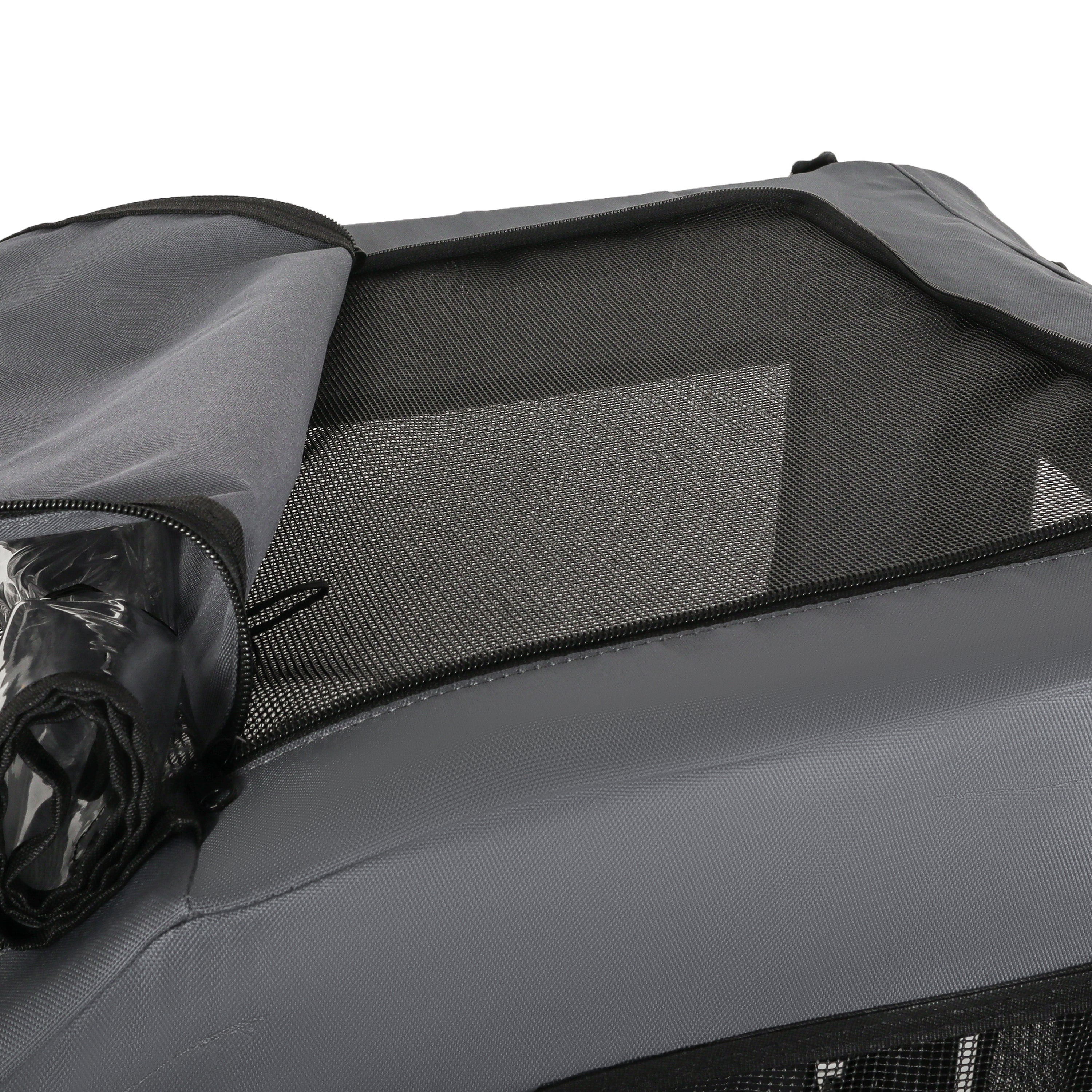 - Waterproof and Breathable: The front of the bike trailer for dogs is equipped with a waterproof curtain to shield your pet from the elements, while mesh curtains offer fresh air and clear visibility, keeping mosquitoes and other insects at bay