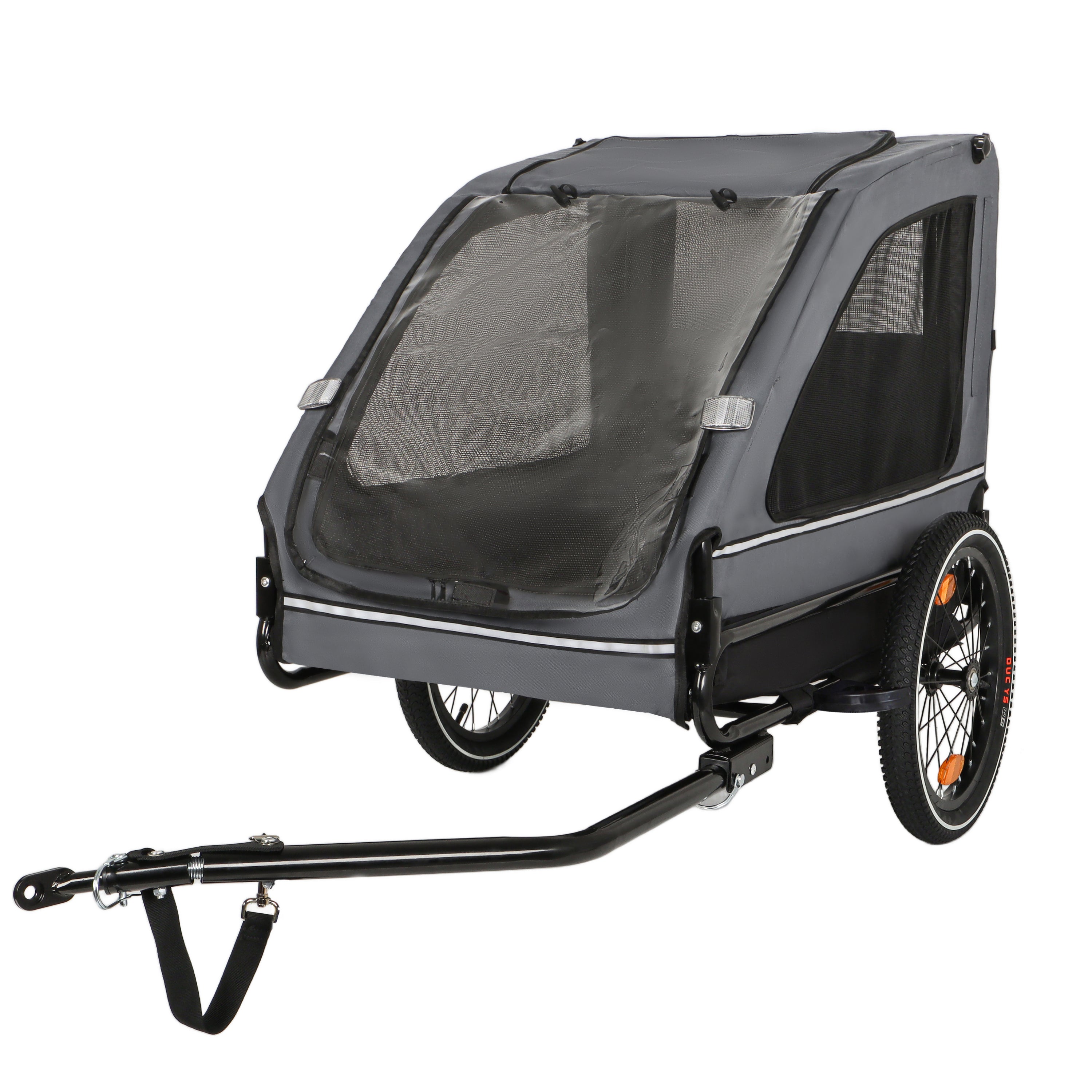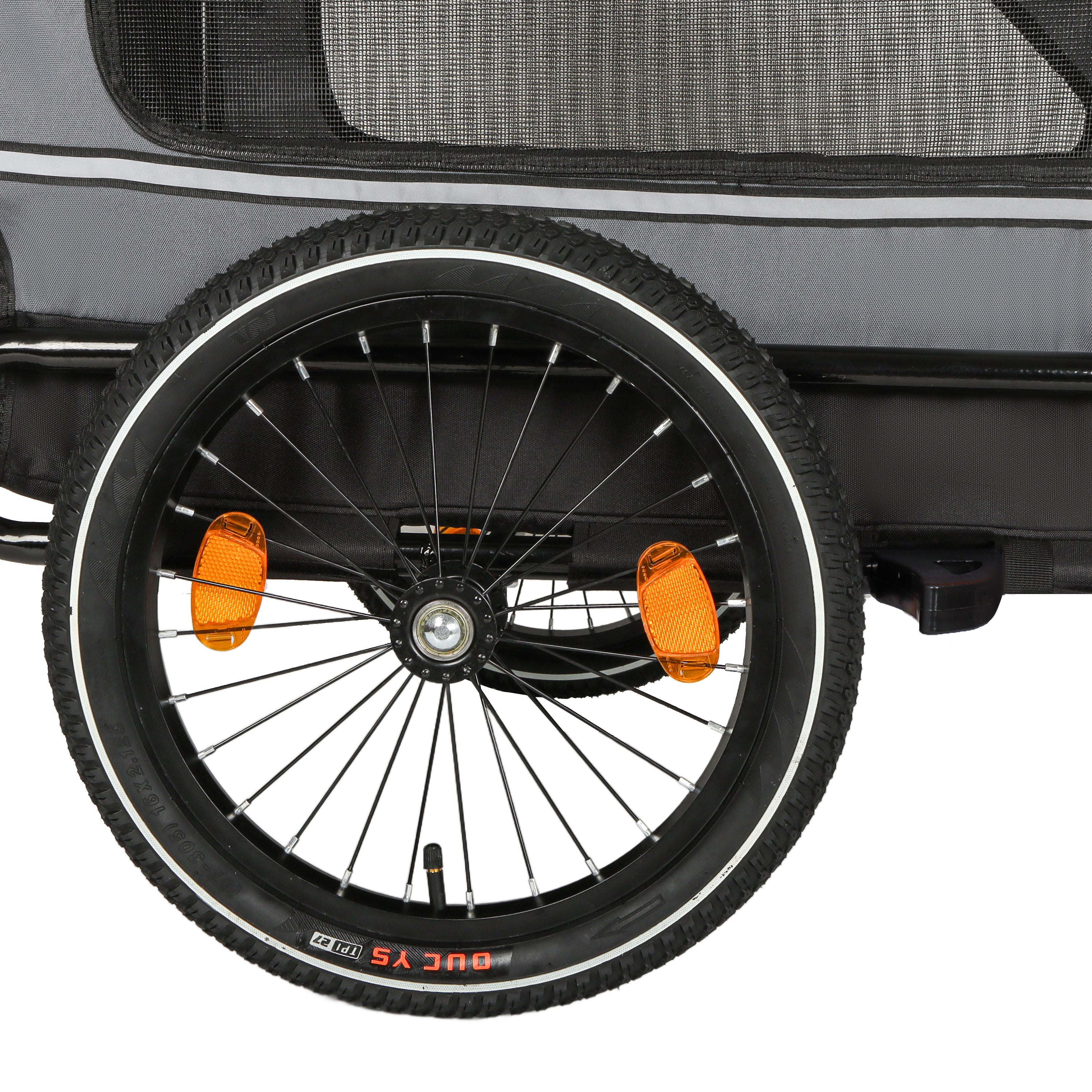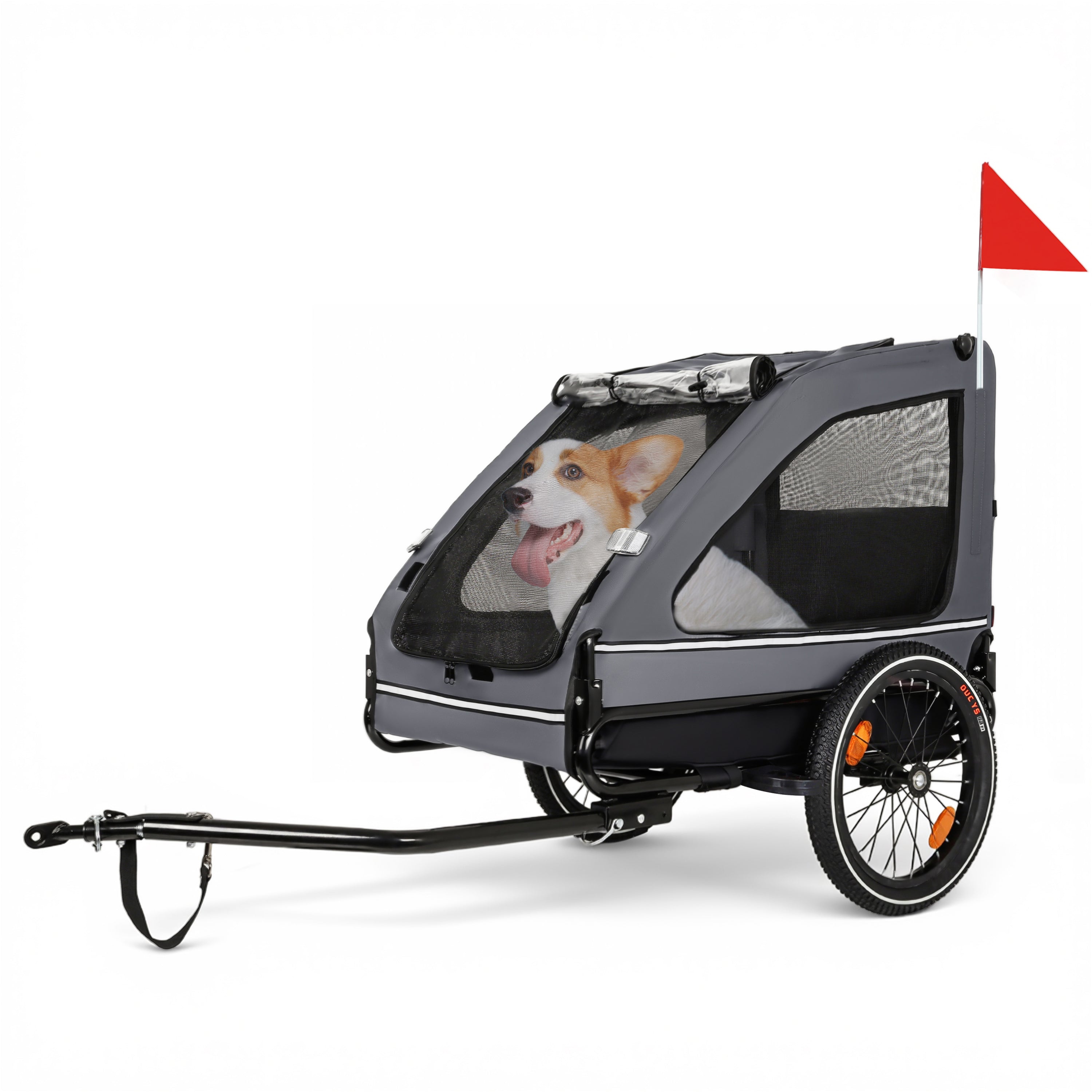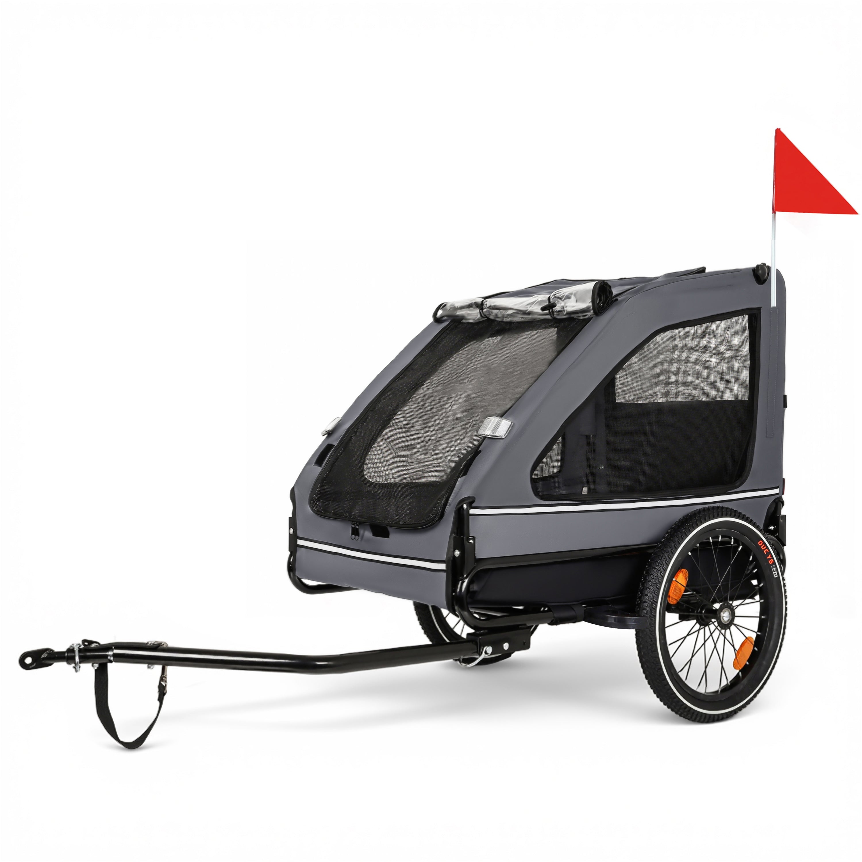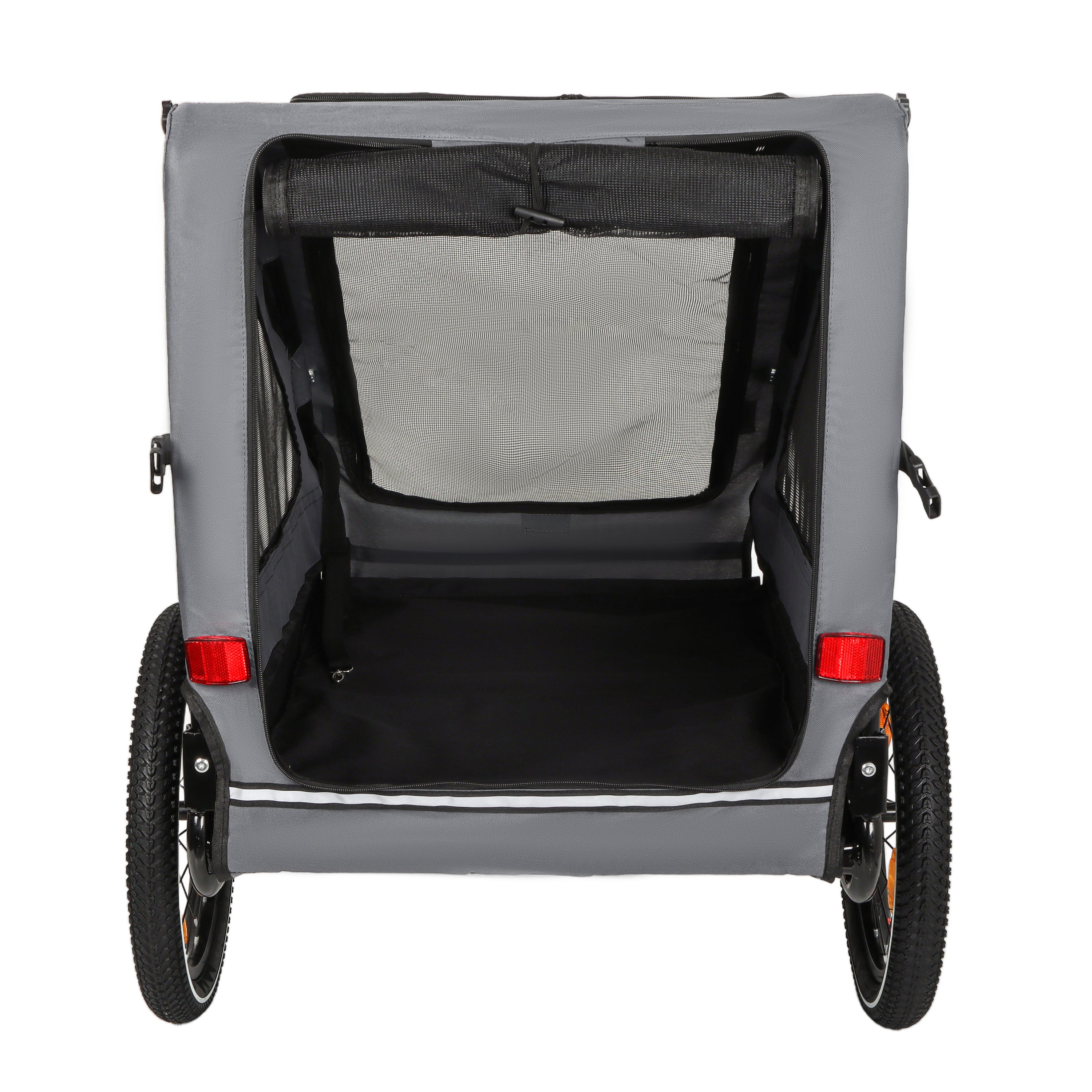 - Safety First: The safety belt inside the dog trailer securely fastens your pet to prevent them from jumping out. A safety flag and Braking device ensure a safe ride, while reflective strips on both sides enhance visibility in low-light conditions