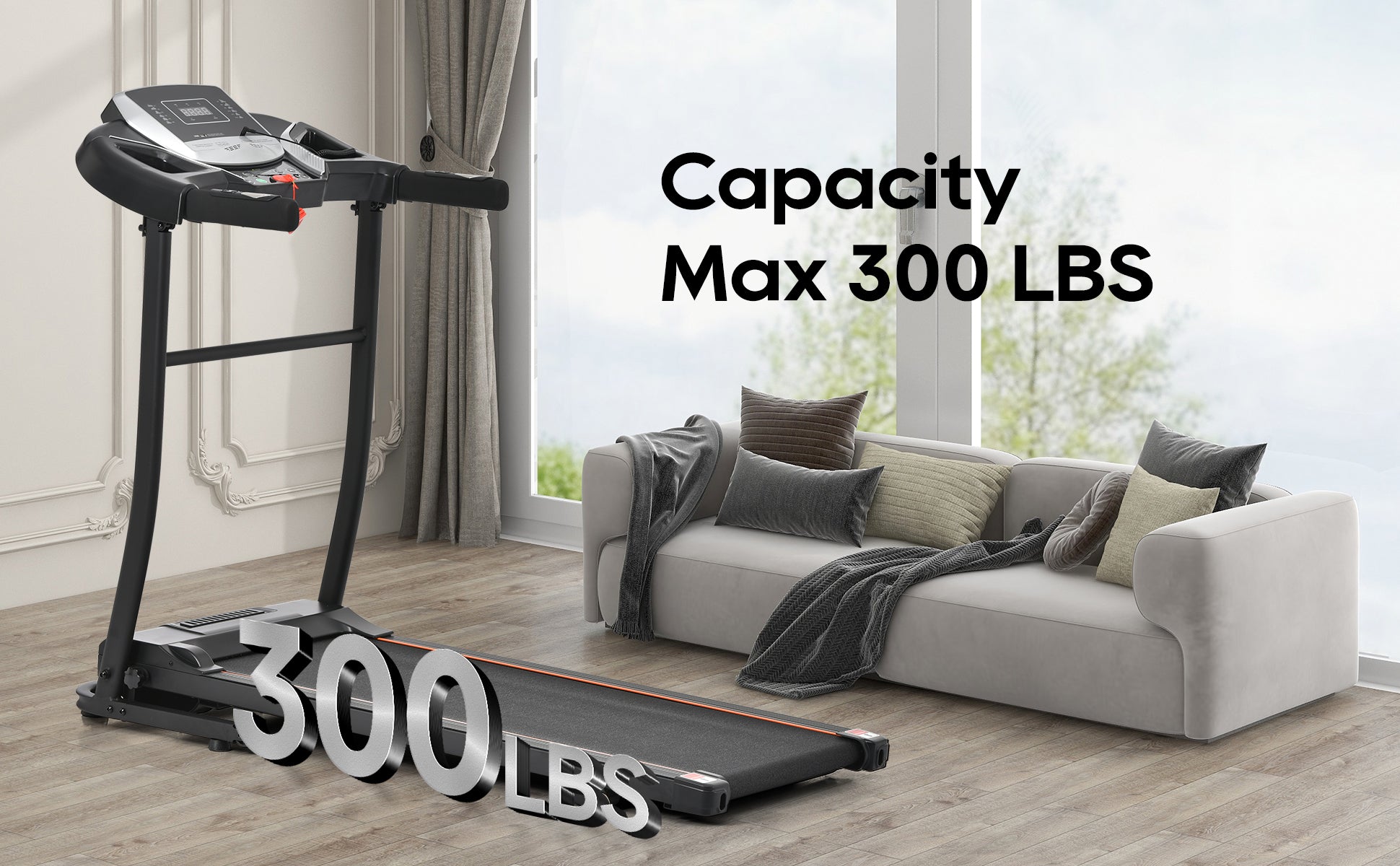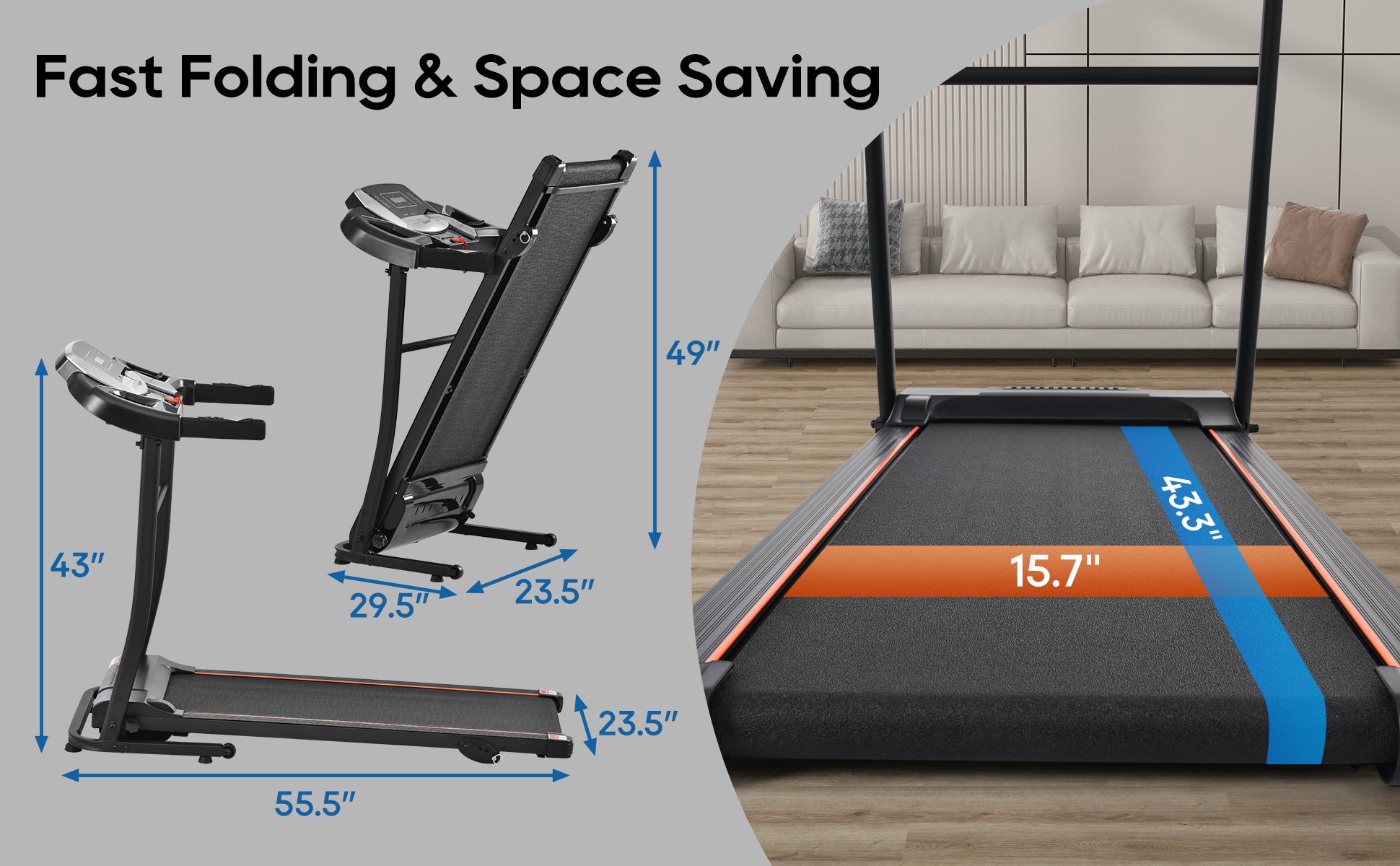 MULTI-FUNCTION HANDRAIL: The multi-functional handlebar effectively assists the user during exercise, supporting quick speed adjustments and one-touch start and stop. Monitor your target heart rate in real time with the built-in handrail heart sensor, tracking your pulse rate during exercise ensures that you are exercising correctly and efficiently. QUIET BRUSHLESS MOTOR: Our brushless motor with max 2.5 HP provides efficient, reliable, and low-maintenance operation, while providing speeds of 7.5 MPH and emitting only 40-65 dB of noise, ensuring your workouts won't disturb your downstairs or next-doors. INCLINE TREADMILL: Customize the intensity of your workout with 3 different manual incline positions. Simulate the challenge of running uphill and feel the burn in your leg muscles as you push yourself to new heights. EASY FOLDING & STORAGE : The two convenient detachable knobs at the bottom side provide easy folding and storage capabilities. Simply loosen the knobs for approx 15 seconds to complete the folding process. The bottom wheels facilitate movement and storage. SMART DISPLAY WITH SPEAKER: Multi-functional LED Display to track your performance in time, speed, distance and calories burnt, promising a superior and effective home treadmill workout. Simply plug in your phone or insert USB flash drive, and you can emerge into training with your workout playlist. Phone/Pad deck available.