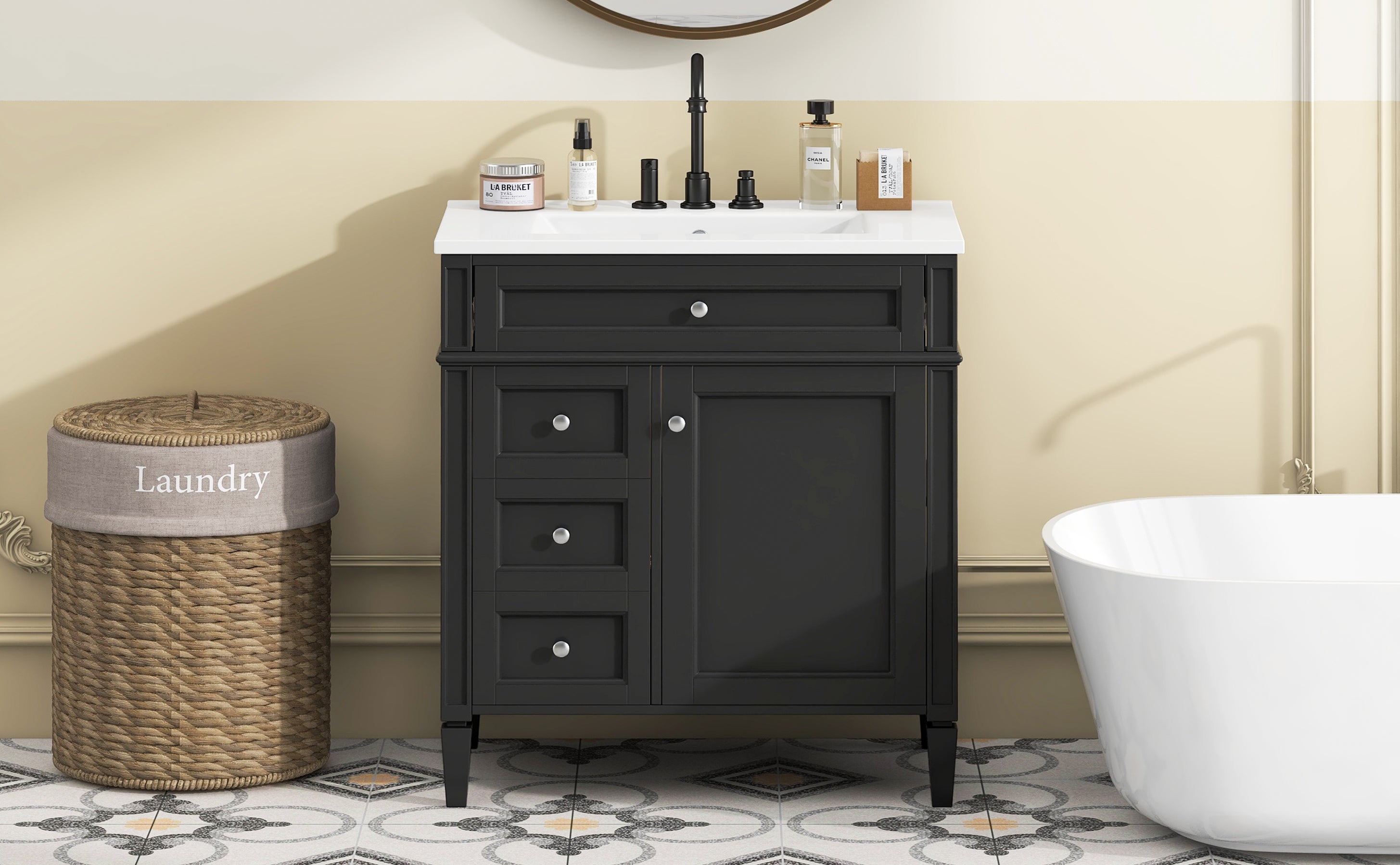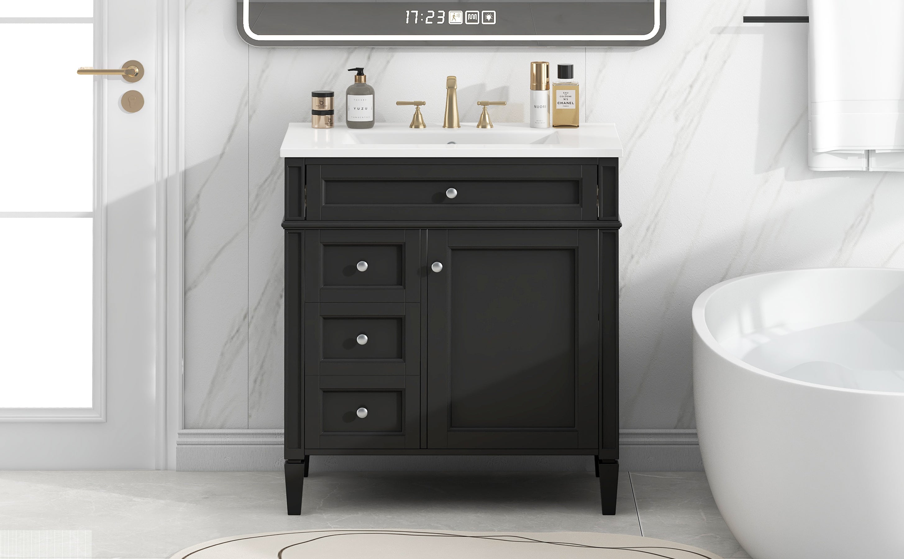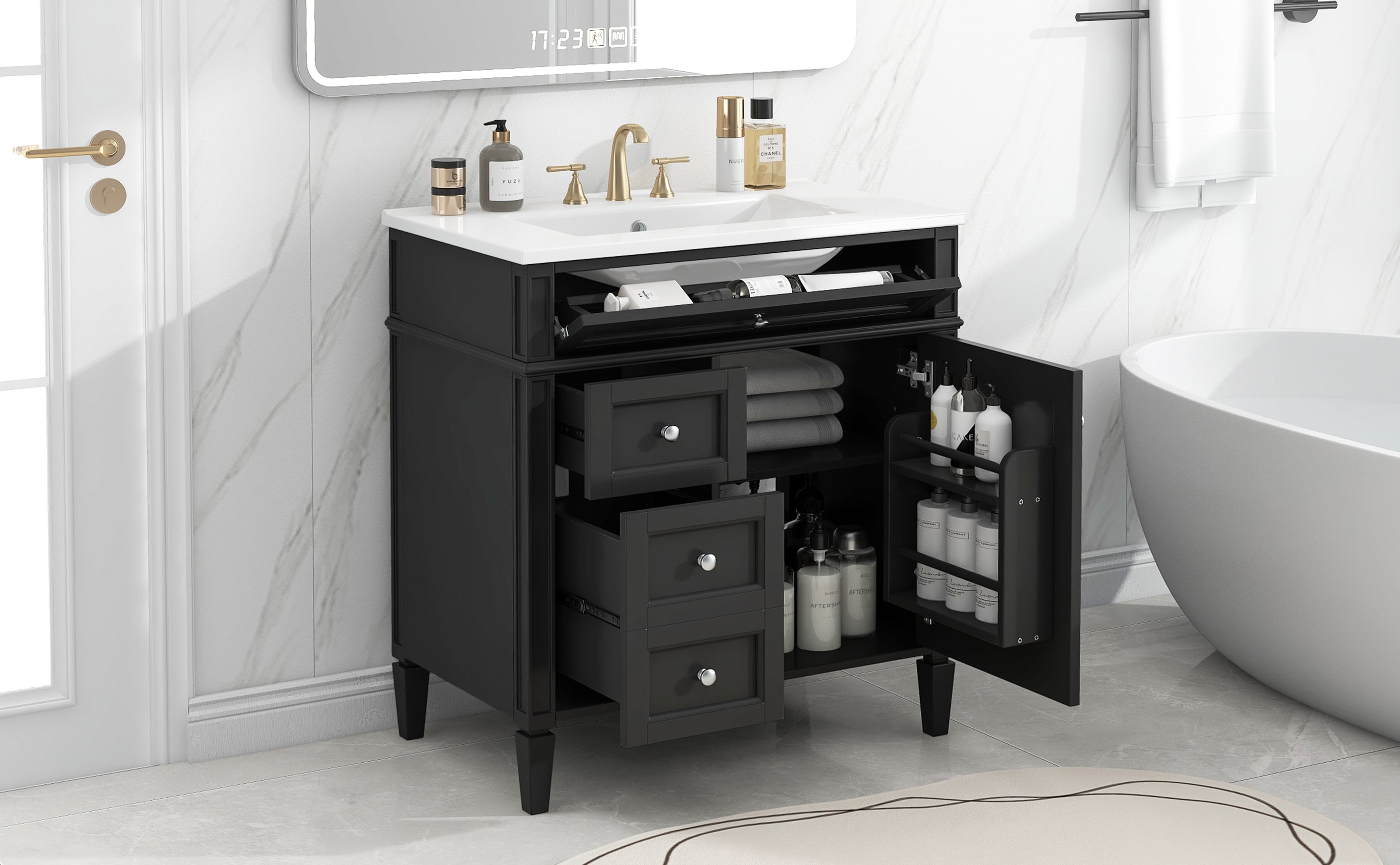 The cabinet design includes 3 drawers and a storage cabinet, providing abundant storage space to help you easily store bath towels, toiletries and other daily necessities. The drawer adopts a silent slide design, which opens and closes smoothly, greatly improving the user experience.