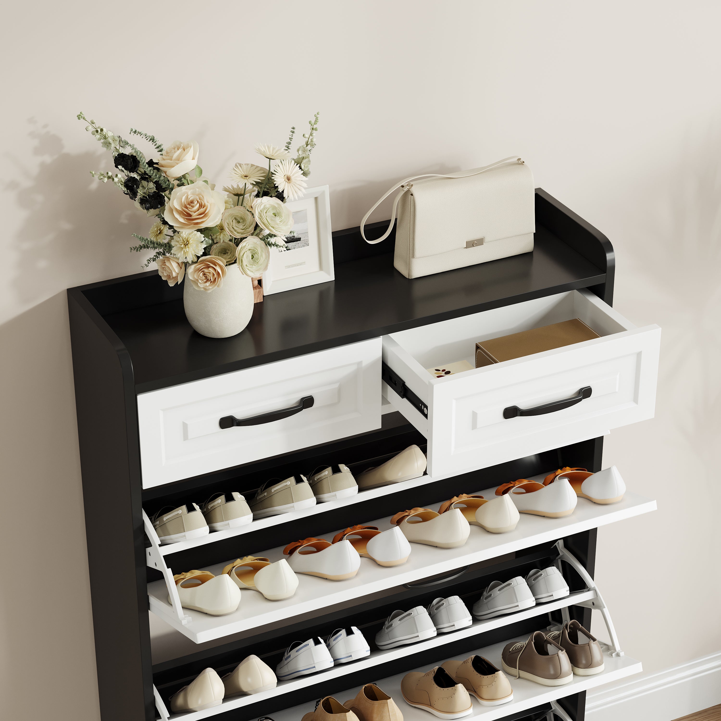 【 Large capacity shoe cabinet 】: The entrance shoe cabinet has 2 drawers and 3 flip drawers, each with 2 layers, effectively organizing all your shoes. The middle compartment of each drawer can be adjusted or disassembled to accommodate different shoe heights. In addition, the spacious top surface is perfect for placing small items, keys, wallets, and other items, making it easy to retrieve them. Entrance shoe cabinet, black shoe cabinet with 3 flip drawers, concealed narrow shoe rack cabinet, independent shoe cabinet storage box, suitable for entrance passages and corridors