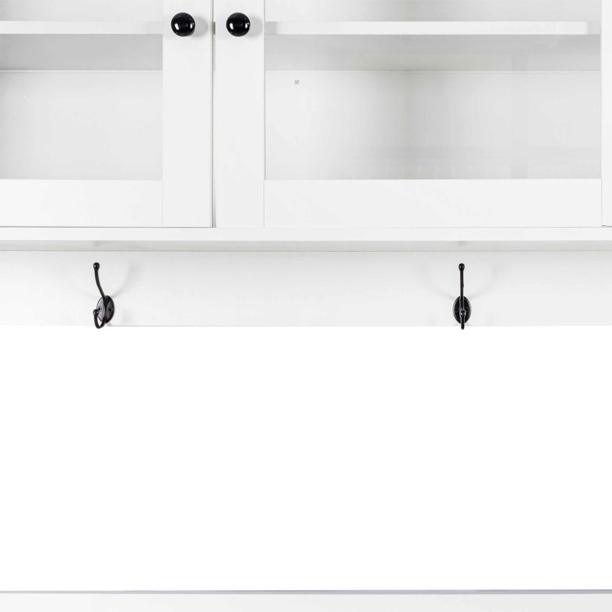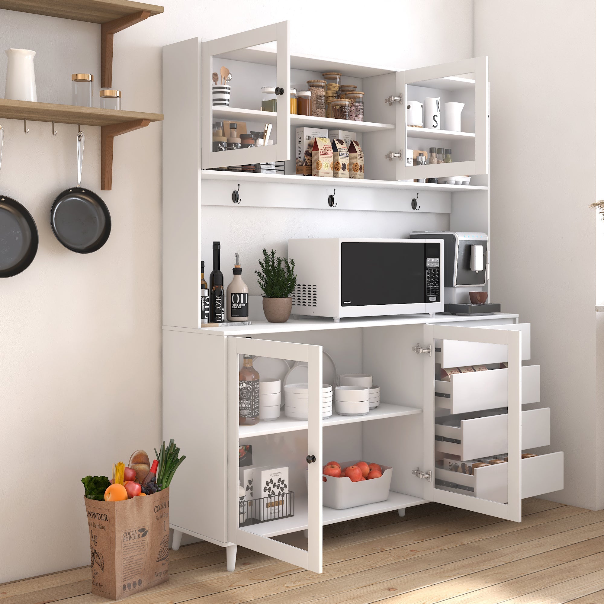 - This integrated kitchen hutch has added more practical storage solutions, including open and closed shelves,drawers, kitchenware hanging hooks and microwave tabletop; protect kitchen stuffs from dust. And the cable management allows to use microwaves and other kitchen appliance more easily