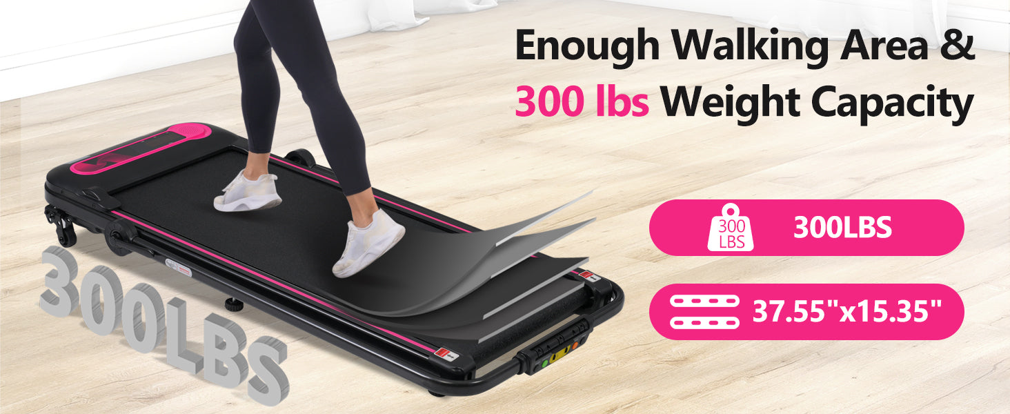 INNOVATIVE 2-IN-1 FOLDING TREADMILL -- Compared to ordinary treadmills, our 2-in-1 treadmill has 2 modes to meet your different sports needs. When the riser is folded, it can be used as a jogging machine at a speed of 0.5MPH-4MPH, when the handrail is raised, the running speed is 4MPH-7.5MPH. POWERFUL 2.5HP -- With a powerful and ultra-quiet 2.5HP motor and load a max weight capacity of 300lbs, this treadmill allows you to walk or run without disturbing others, making it ideal for home and office use. With a sturdy and durable steel frame and multi-layer shield design, it's shock-absorbing and noise-reducing, making your running quieter, safer and more comfortable. WITH PHONE HOLDER, REMOTE CONTROL & Armrest CONTROL -- You can also use the phone holder to watch videos or chat with friends. The remote control (BATTERY INCLUDED) is convenient to adjust the speed of movement and stop instantly. NO INSTALLATION -- No need to install, just take this walking pad out and use it. The dimension of the electric treadmill is 45.66'*19.29'*3.93'. With transport wheels, you can easily move and store it under a sofa, bed, or behind a door, which greatly frees up some floor space. FITNESS TRACKING DISPLAY -- Our portable Treadmill is designed with a LED display to show speed, distance, time, and calories burned, allowing you to visualize your exercise and maintain motivation. You can control the speed or stop the treadmill by pressing the remote control. PROTECT YOUR KNEES -- 5 layer anti-slip belt of this desk treadmill is designed to absorb the force of your step, to protect your joints and ligaments from damage. NEW DESIGN WITH INCLINE--New Treadmill With One Second Incline Adjustment. Burn fat more effectively