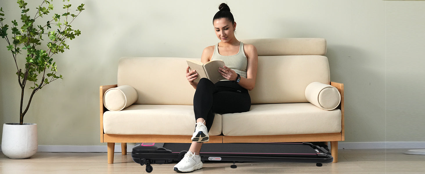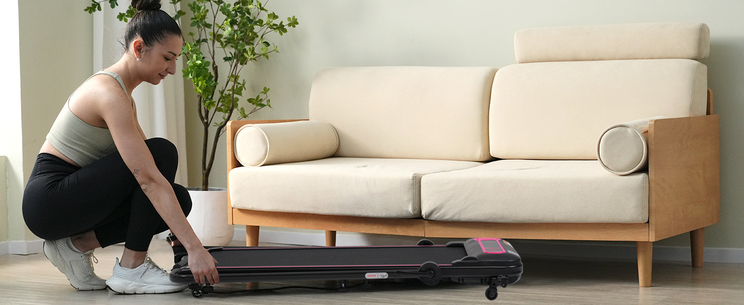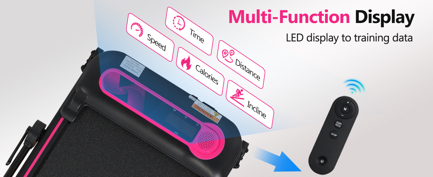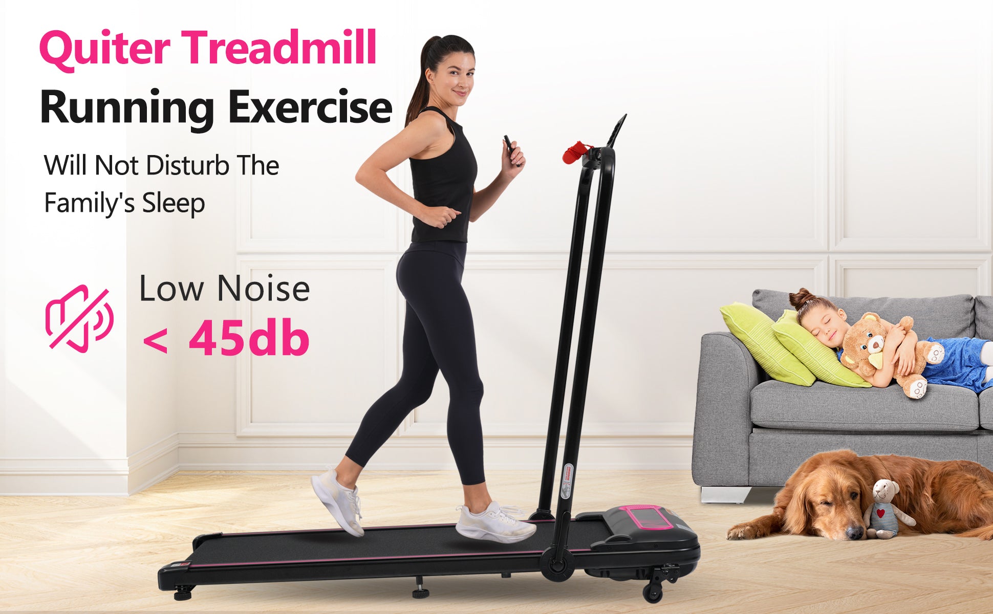 INNOVATIVE 2-IN-1 FOLDING TREADMILL -- Compared to ordinary treadmills, our 2-in-1 treadmill has 2 modes to meet your different sports needs. When the riser is folded, it can be used as a jogging machine at a speed of 0.5MPH-4MPH, when the handrail is raised, the running speed is 4MPH-7.5MPH. POWERFUL 2.5HP -- With a powerful and ultra-quiet 2.5HP motor and load a max weight capacity of 300lbs, this treadmill allows you to walk or run without disturbing others, making it ideal for home and office use. With a sturdy and durable steel frame and multi-layer shield design, it's shock-absorbing and noise-reducing, making your running quieter, safer and more comfortable. WITH PHONE HOLDER, REMOTE CONTROL & Armrest CONTROL -- You can also use the phone holder to watch videos or chat with friends. The remote control (BATTERY INCLUDED) is convenient to adjust the speed of movement and stop instantly. NO INSTALLATION -- No need to install, just take this walking pad out and use it. The dimension of the electric treadmill is 45.66'*19.29'*3.93'. With transport wheels, you can easily move and store it under a sofa, bed, or behind a door, which greatly frees up some floor space. FITNESS TRACKING DISPLAY -- Our portable Treadmill is designed with a LED display to show speed, distance, time, and calories burned, allowing you to visualize your exercise and maintain motivation. You can control the speed or stop the treadmill by pressing the remote control. PROTECT YOUR KNEES -- 5 layer anti-slip belt of this desk treadmill is designed to absorb the force of your step, to protect your joints and ligaments from damage. NEW DESIGN WITH INCLINE--New Treadmill With One Second Incline Adjustment. Burn fat more effectively
