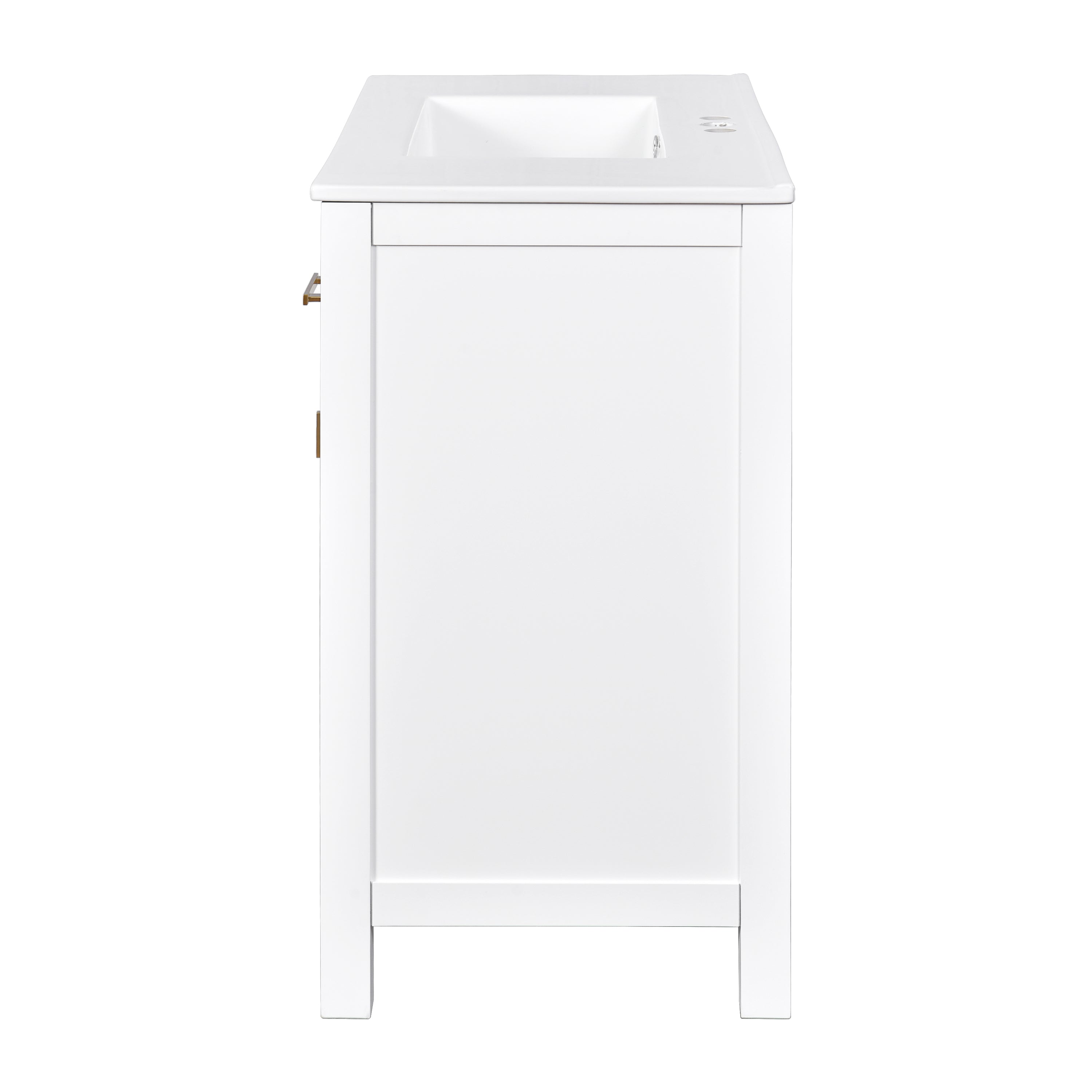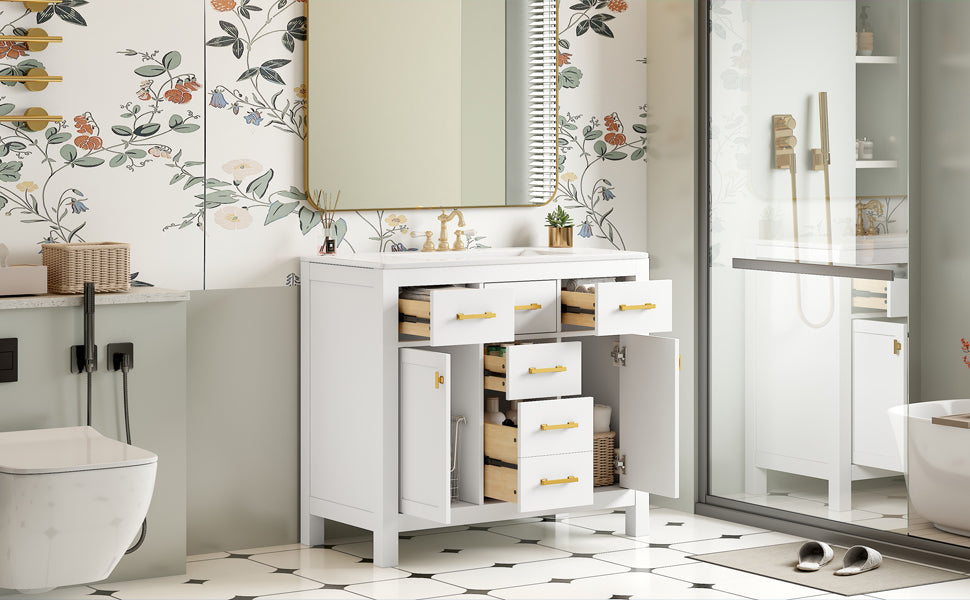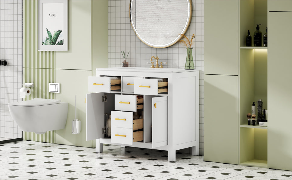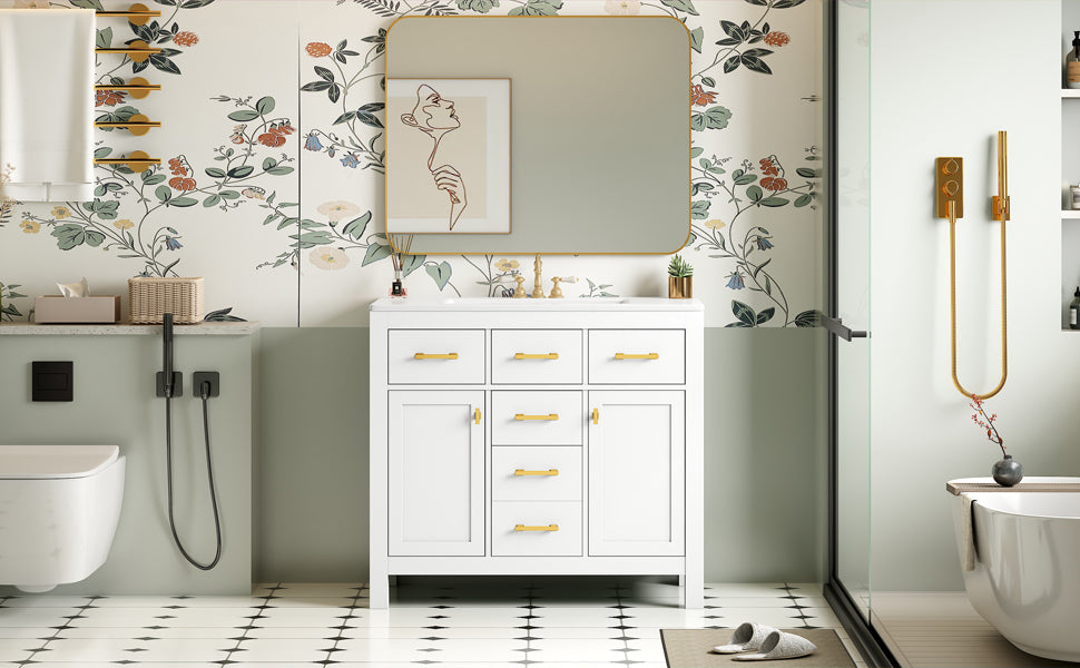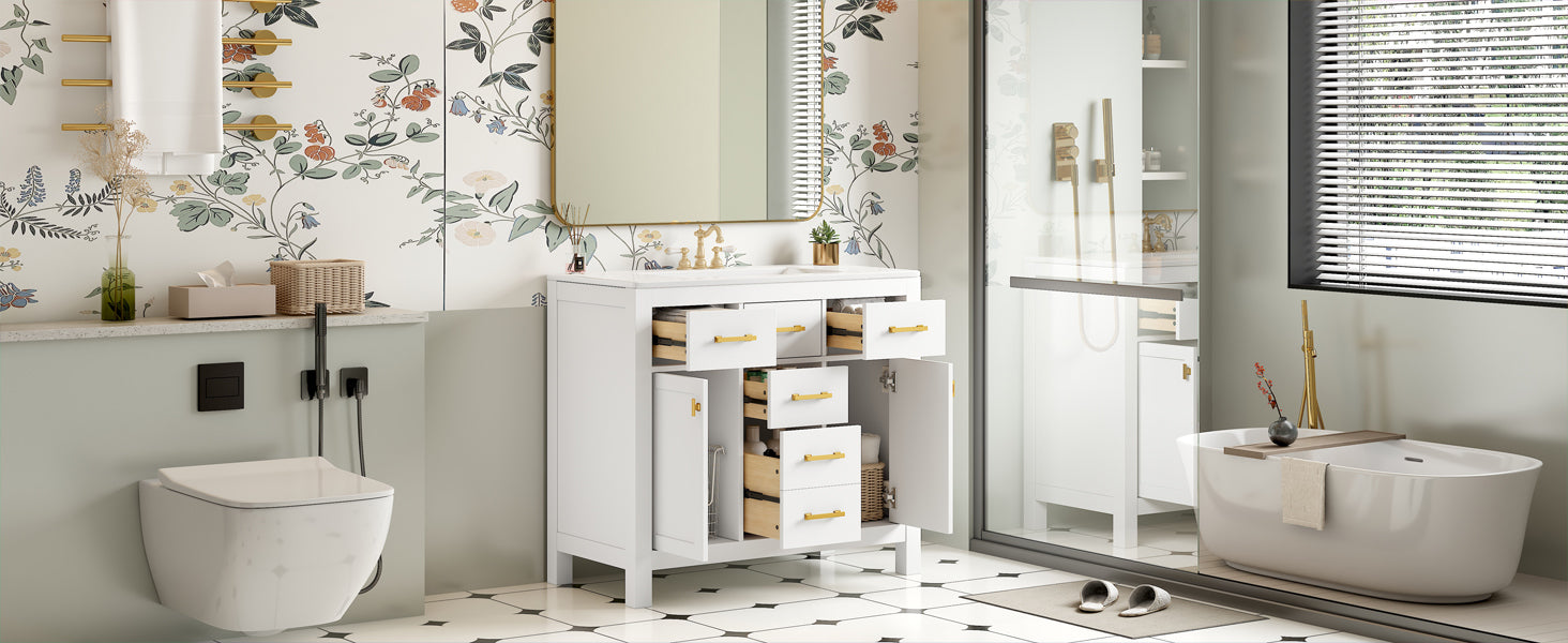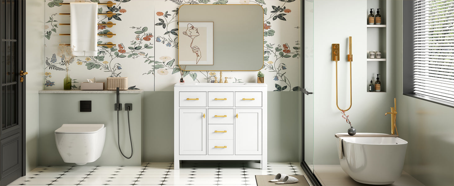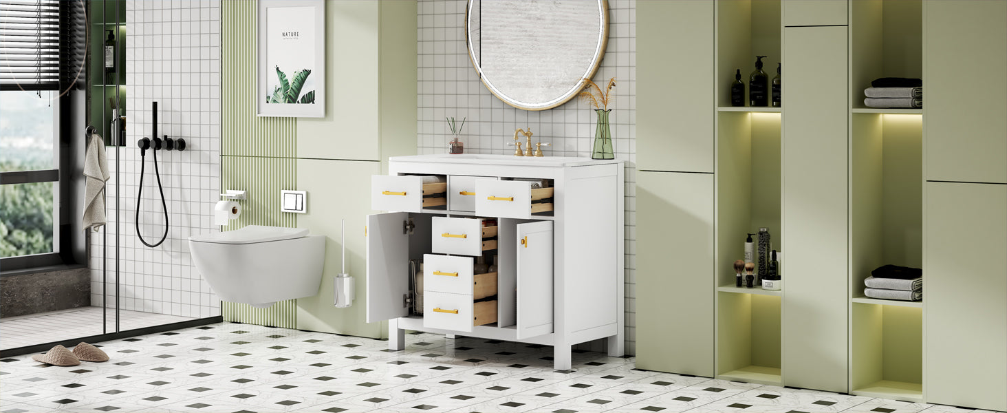 - [Modern Minimalist Style]This 36-inch bathroom vanity has a simple and clean design. The sink is made of creamic and is easy to clean. The cabinet features a traditional shaker style design with a painted finish to bring a modern and luxurious look to your bathroom. Complements a variety of bathroom styles!