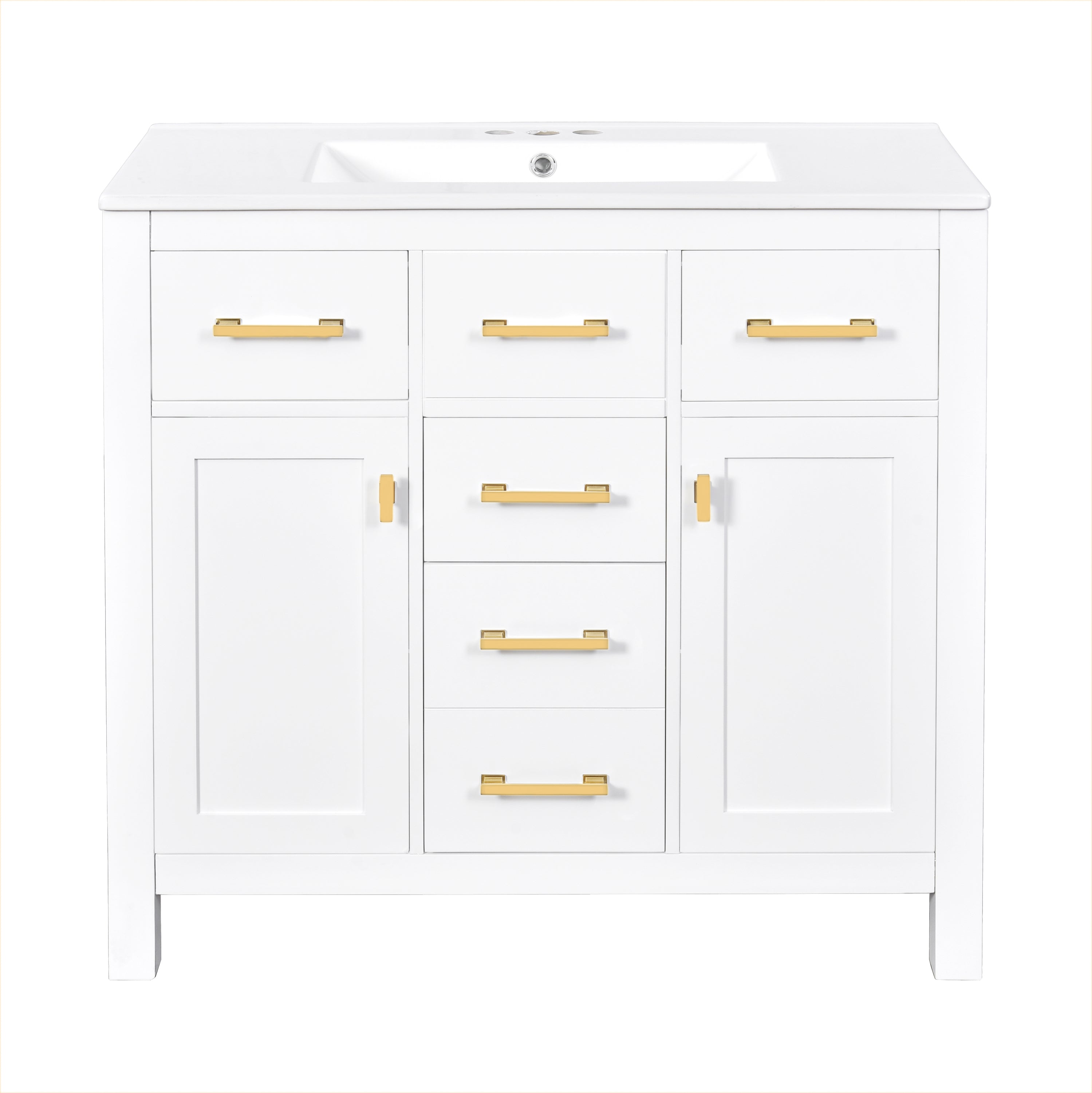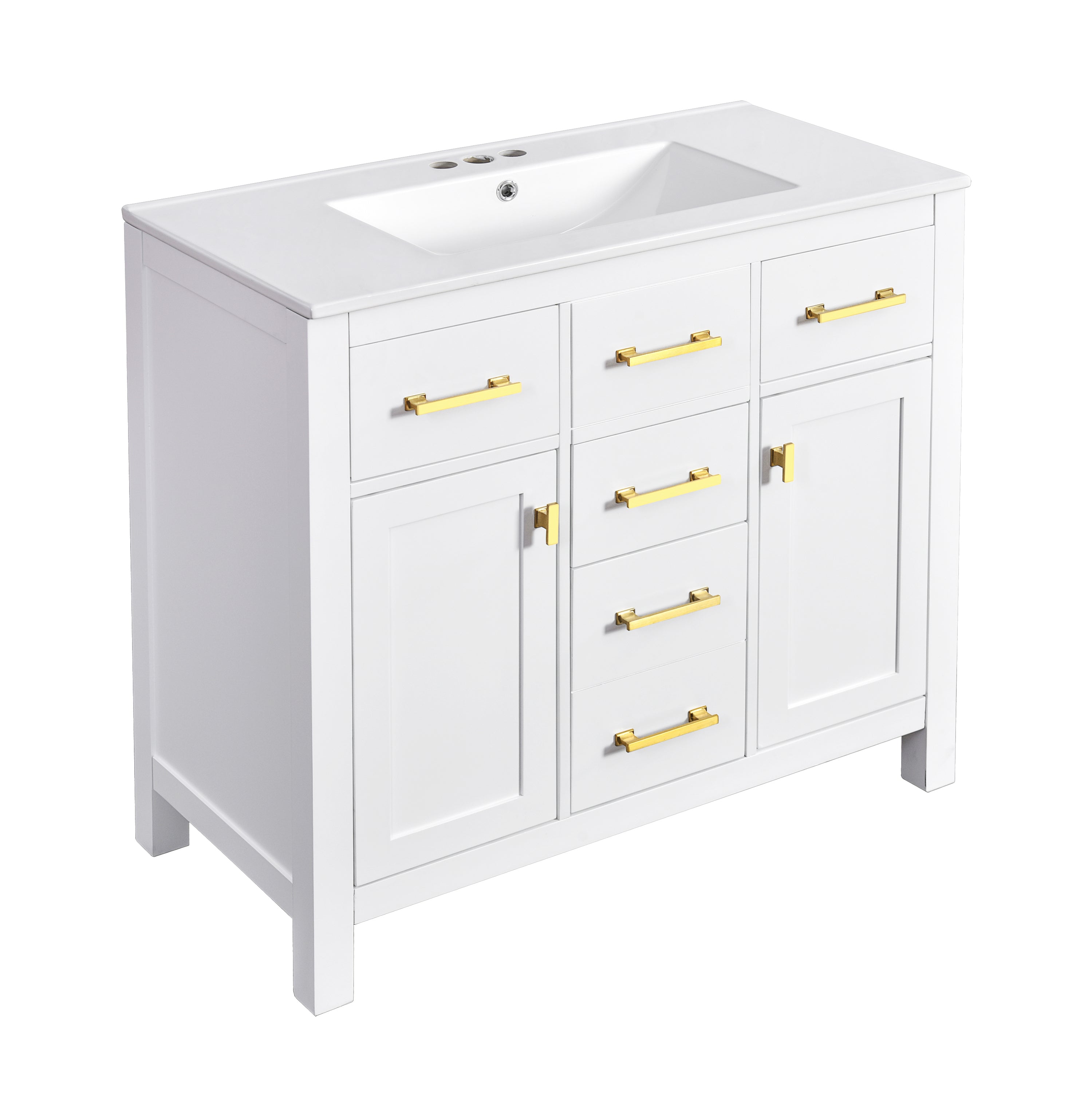 1. Four Extension Drawers 2. Two Soft-close Doors 2. Waterproof Painted Finish 3. Exquisite Gold Handle 4. Solid Wood Frame 5. High Quality MDF Boards 6. Durable Ceramic Basin 7. Smooth Slide Rail