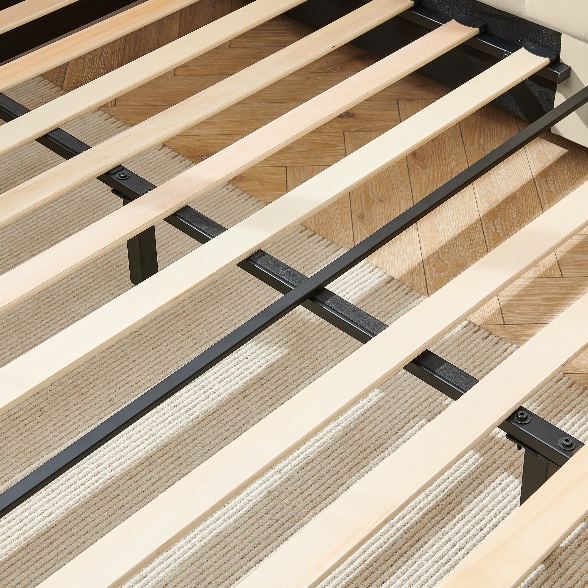 Beige mid-century velvet upholstered full-size tufted bed frame