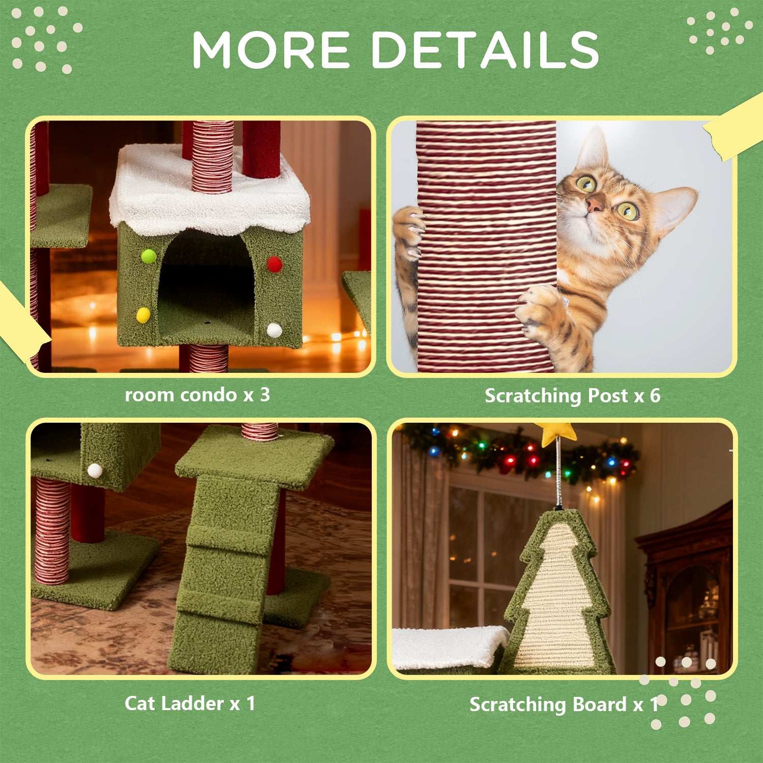 - Festive Christmas Design: Immerse your feline friend in the holiday spirit with this cat tree featuring a charming Christmas theme. Adorned with a Christmas tree topped with a golden star, snow - capped platforms, and cute decorative dots, it brings the joy of Christmas right into your home, making it a perfect festive addition for both cats and cat lovers during the holiday season.