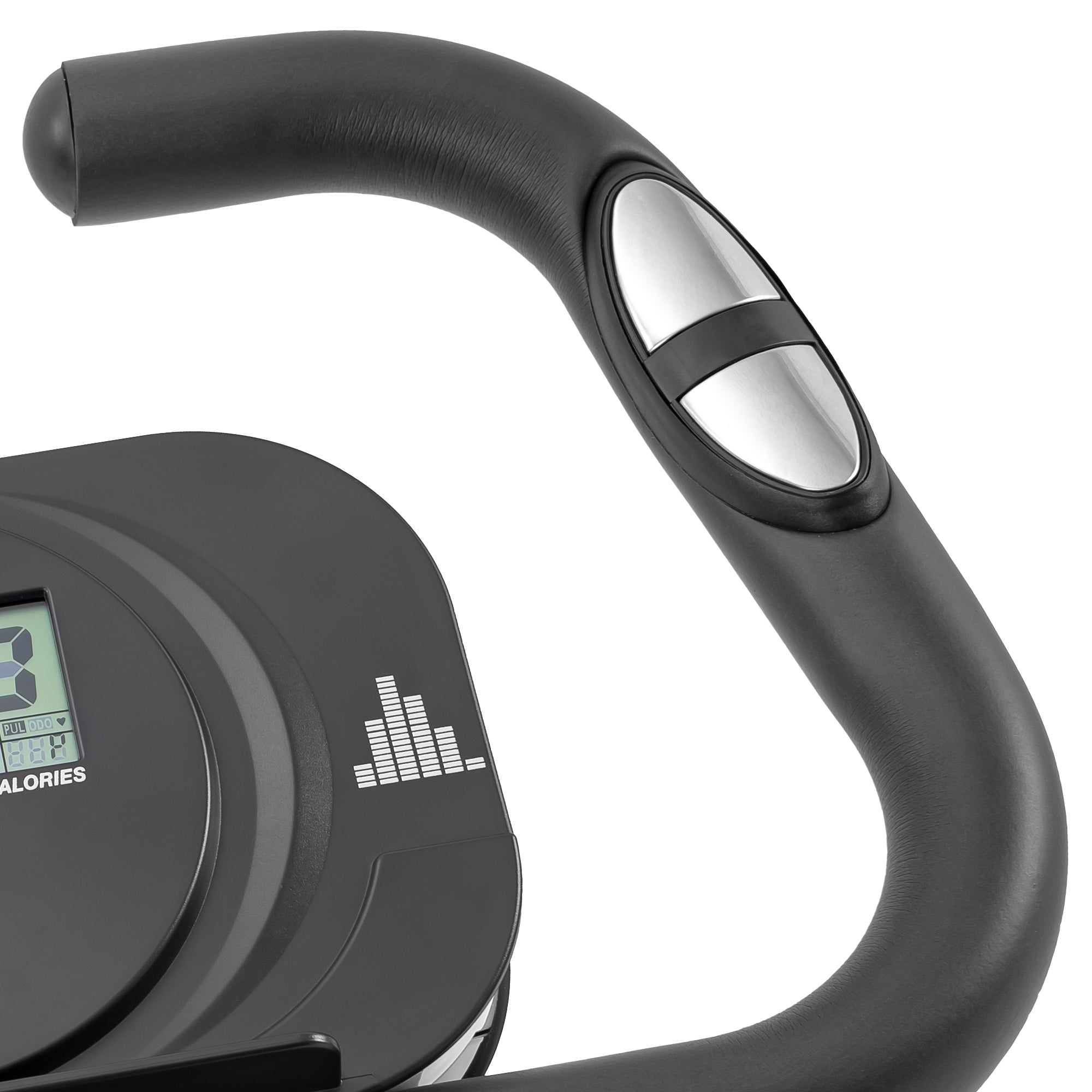 Folding Exercise Bike, Fitness Upright and Recumbent X-Bike with 16-Level Adjustable Resistance, Arm Bands and Backrest Functional Foldable Design - Get intensive workout with an upright position, or easily convert it to recumbent exercise position for a casual workout. Folds up and out of the way when you're done with your workout. Large LCD Display - Monitor your your workout in speed, distance, heart rate, calories burnt, and time add up to keep your motivated. Convenient phone/pad holder equipped to dock your device for reading or entertaining. 16-Level Adjustable Resistance - Warm up with easy pedaling and then increase intensity to make the most out of your workout. Other Features - Innovative arms bands for upper body strength training. Pedals with straps to keep your feet in place to increase stability. Transport wheels help you move the bike out of the way fast and easy. Measurement - Recumbent Size: 30.7'' x 19.7'' x 42.3''(L x W x H); Upright Size: 25'' x 19.7'' x 47.6'' (L x W x H); Folded Size: 9'' x 19.7'' x 54.7'' (L x W x H); Weight Capacity: 350 LBS. Inseam Length: 29''~33'' (inch) EXERCISE BIKE Frame Steel Resistance Control 16-Level tension knob Seat Ergonomic over-sized padded seat, 2-way adjustable Display Speed, Time, Distance, Calories and Hand pulse Transport Roller With wheels for easy movement Arm Bands YES Max. User Weight 350 LBS Recumbent Dimensions 30.7'' x 19.7'' x 42.3'' Upright Dimensions 25'' x 19.7'' x 47.6'' Folded Dimensions 9'' x 19.7'' x 54.7'' Product Weight 42 LBS Package Dimensions 45.87'' x 15.35'' x 8.46'' Package Weight 47.62 LBS Assembly Assembly required Tools Tools required during assembly are included in package