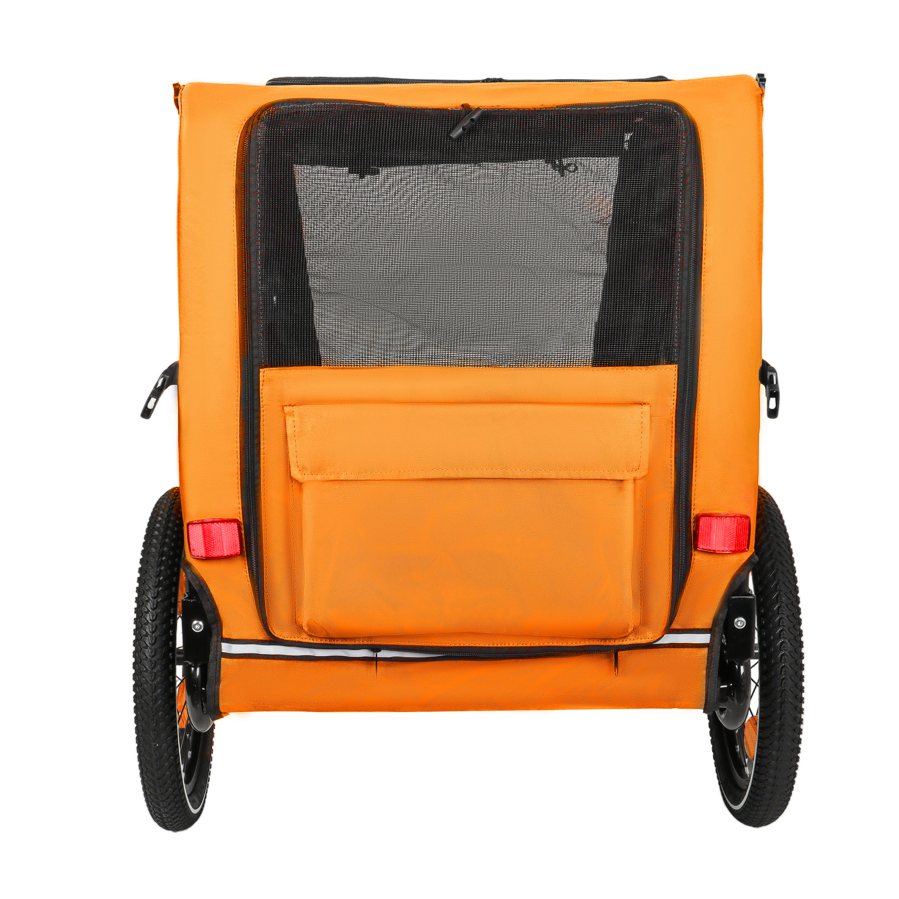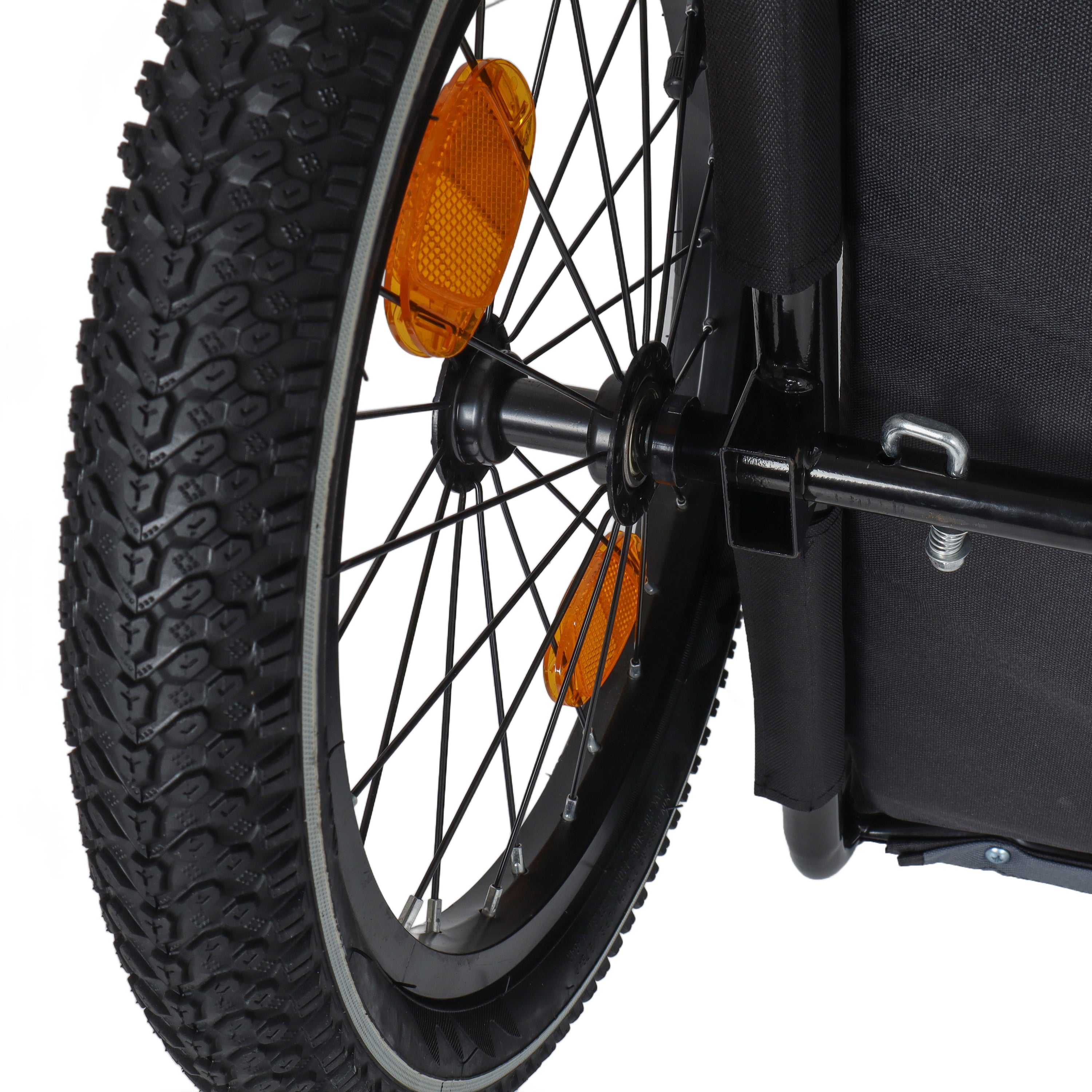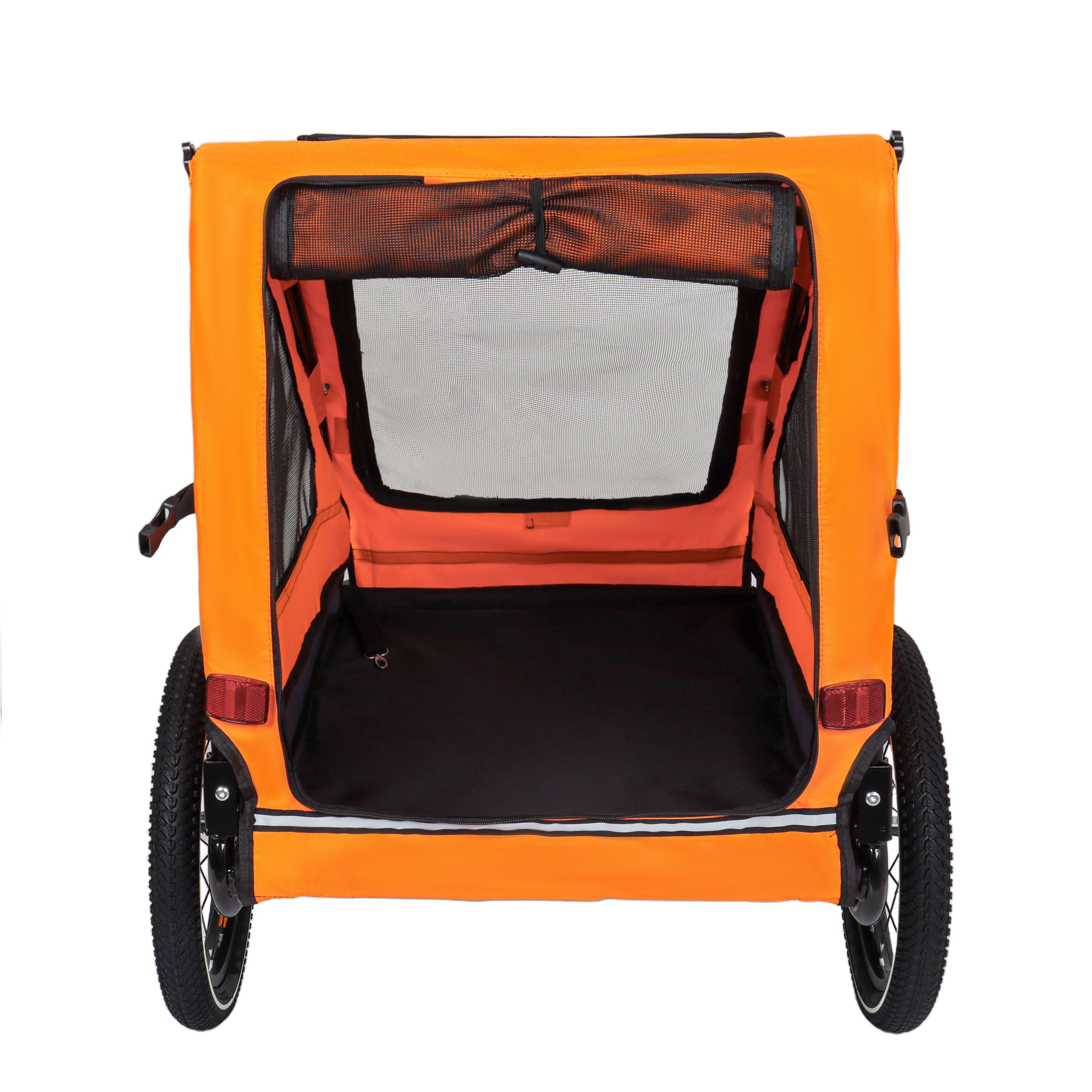 - Safety First: The safety belt inside the dog trailer securely fastens your pet to prevent them from jumping out. A safety flag and Braking device ensure a safe ride, while reflective strips on both sides enhance visibility in low-light conditions