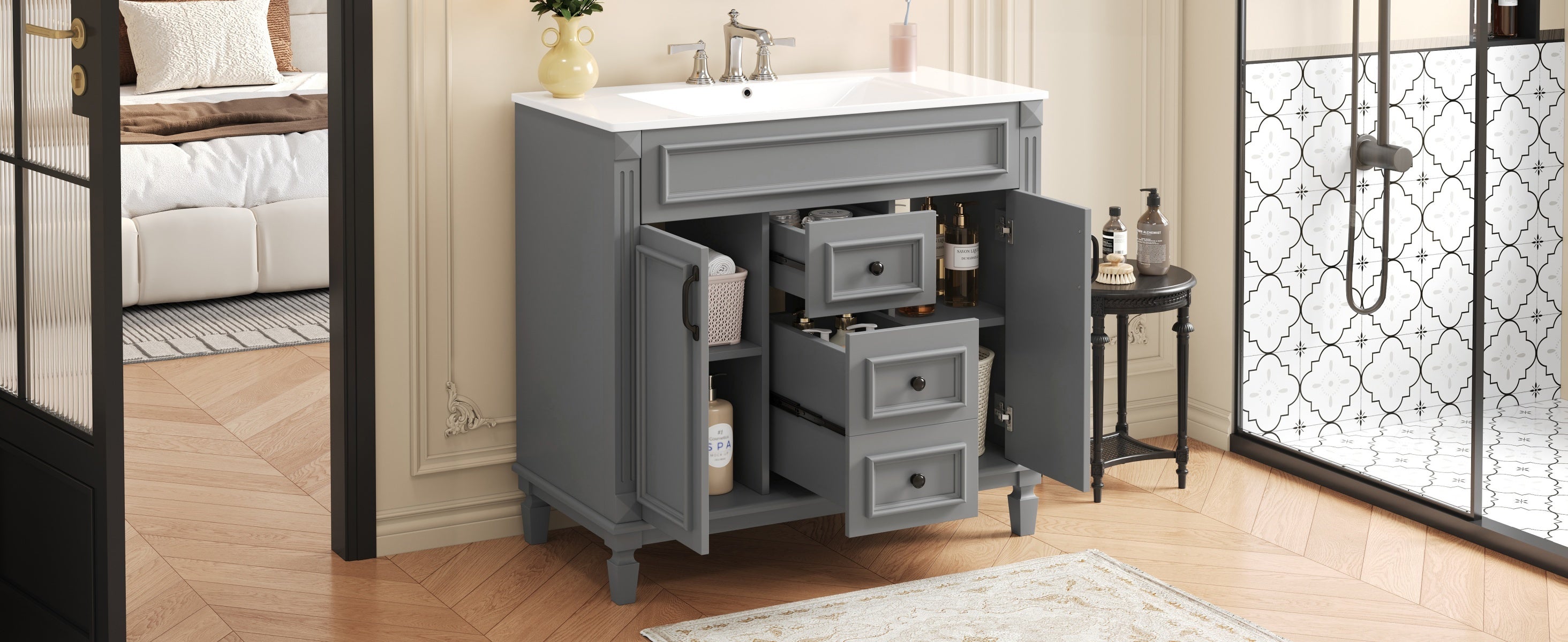 - [ Multi-Purpose Cabinet & Concealed Storage ] Are you looking for stylish and functional storage solutions for your bathroom? Our bathroom vanity provide ample space for all your toiletries and bathroom essentials. The combination of the cabinet body and the drawer perfectly stores all kinds of bathroom products and keeps the necessities away from water stains and dust. Soft-close doors and drawer fronts feature a water-resistant paint finish for durability.