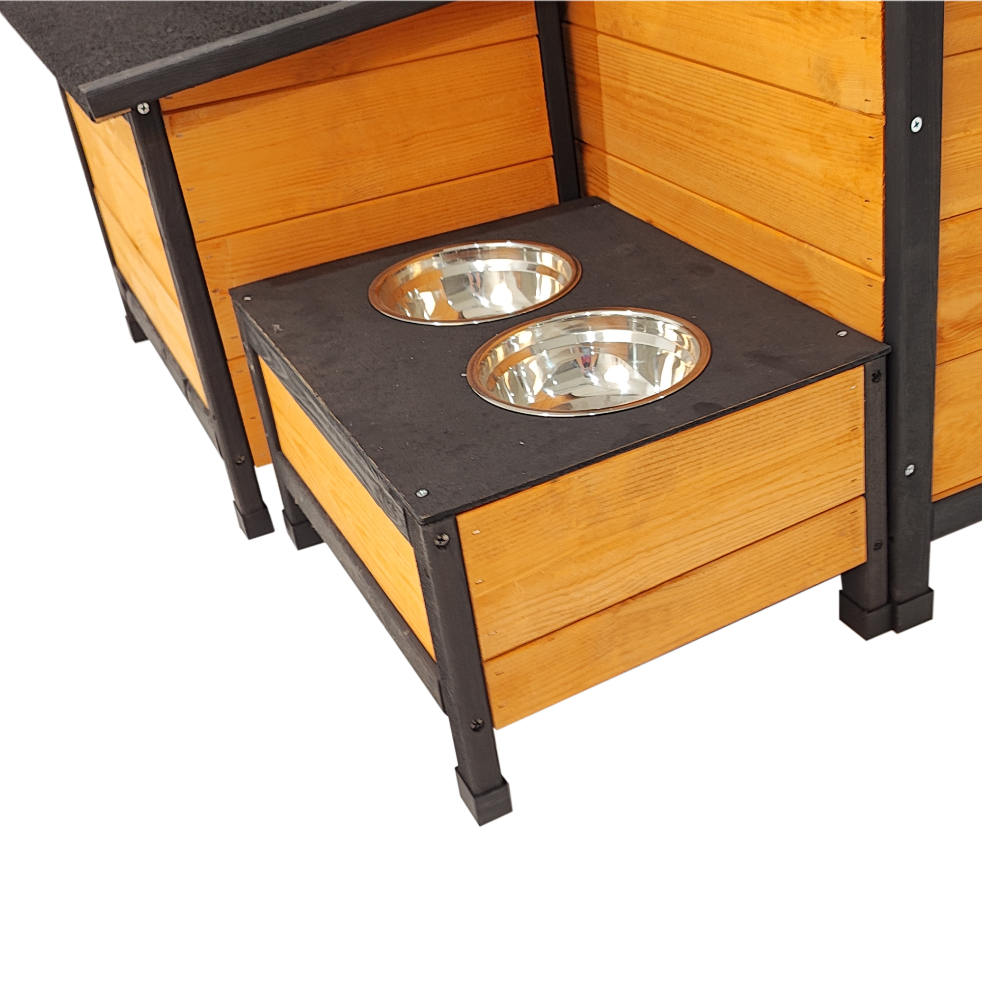 Introducing the ultimate retreat for your furry friends - the Collection Dog House. This beautifully crafted wooden structure is more than just a dog house; It's a cozy sanctuary where your beloved pet can relax, dine, and play in style. At 55.12 inches long, 38.98 inches wide, and 37.00 inches tall, this spacious dog house can comfortably accommodate multiple dogs, making it perfect for families with more than one furry companion. The thoughtful design includes two metal bowls so your dog can conveniently enjoy their food in their own space. Additionally, built-in shelves provide designated areas for bowls, keeping the feeding area organized and easily accessible. The included toy box ensures your pet's favorite toys are always within reach, creating an environment full of fun and activity.The door curtain is made of PVC material, which can effectively prevent rainwater from drifting into the house and has a good windproof effect.