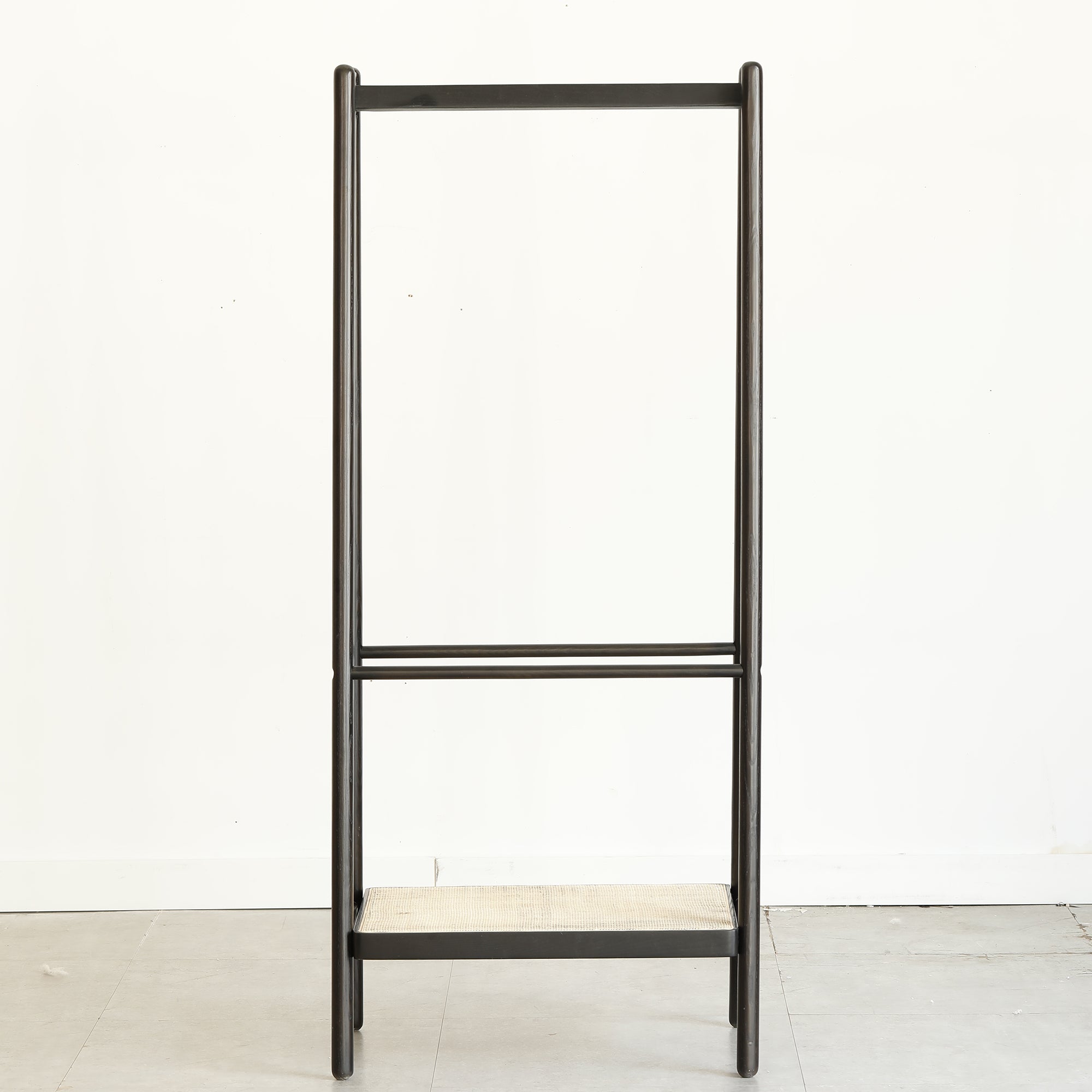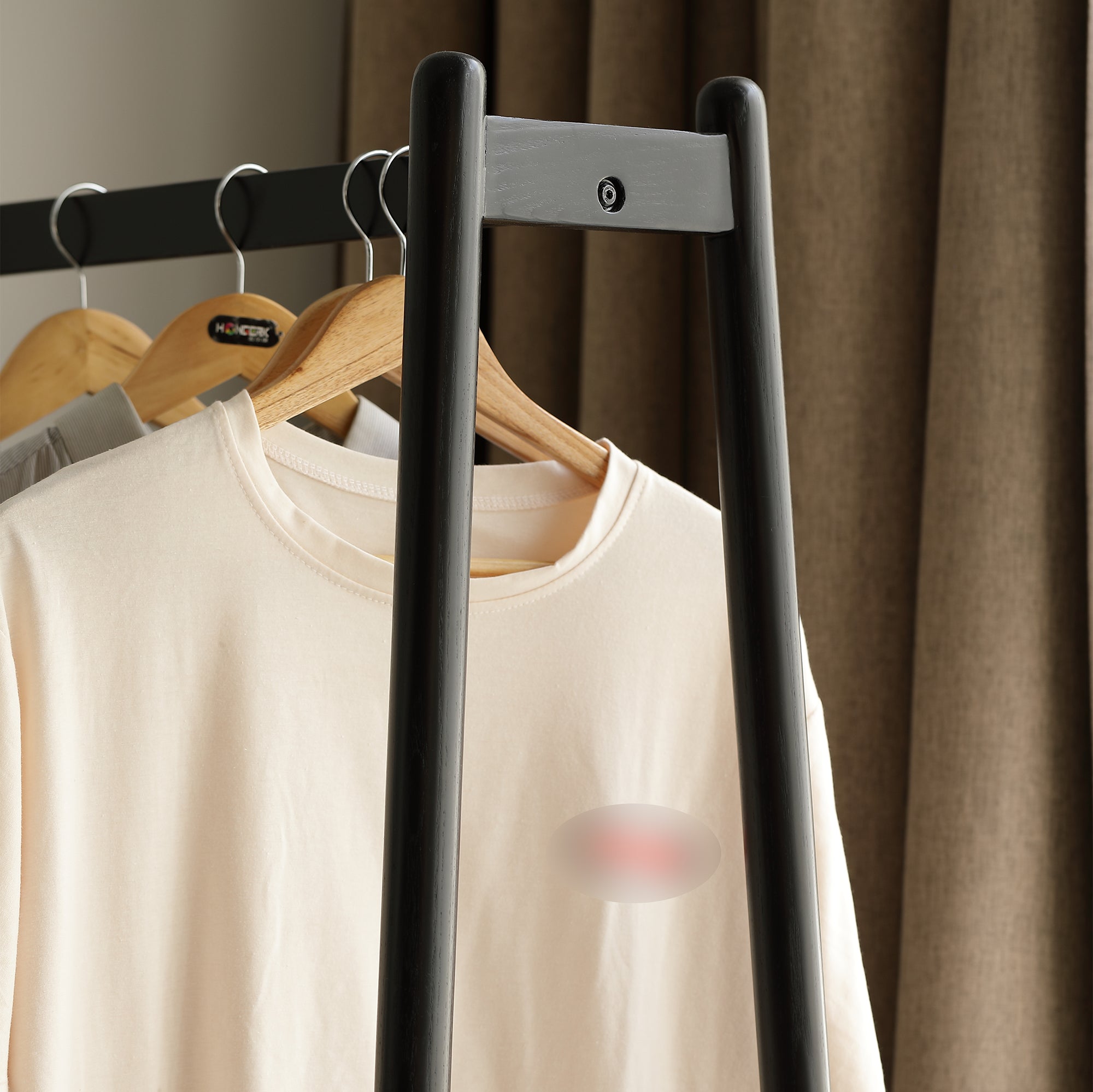 Solid oak clothes hanger, natural wood grain texture, stable wood color, reliable as the earth. It stands firmly by the door, with a solid background of home