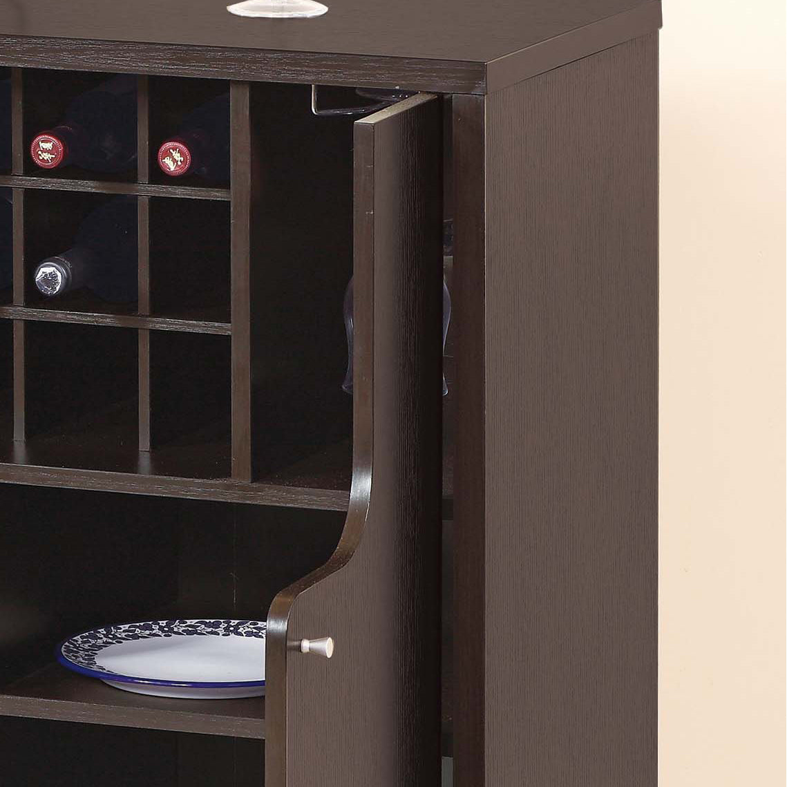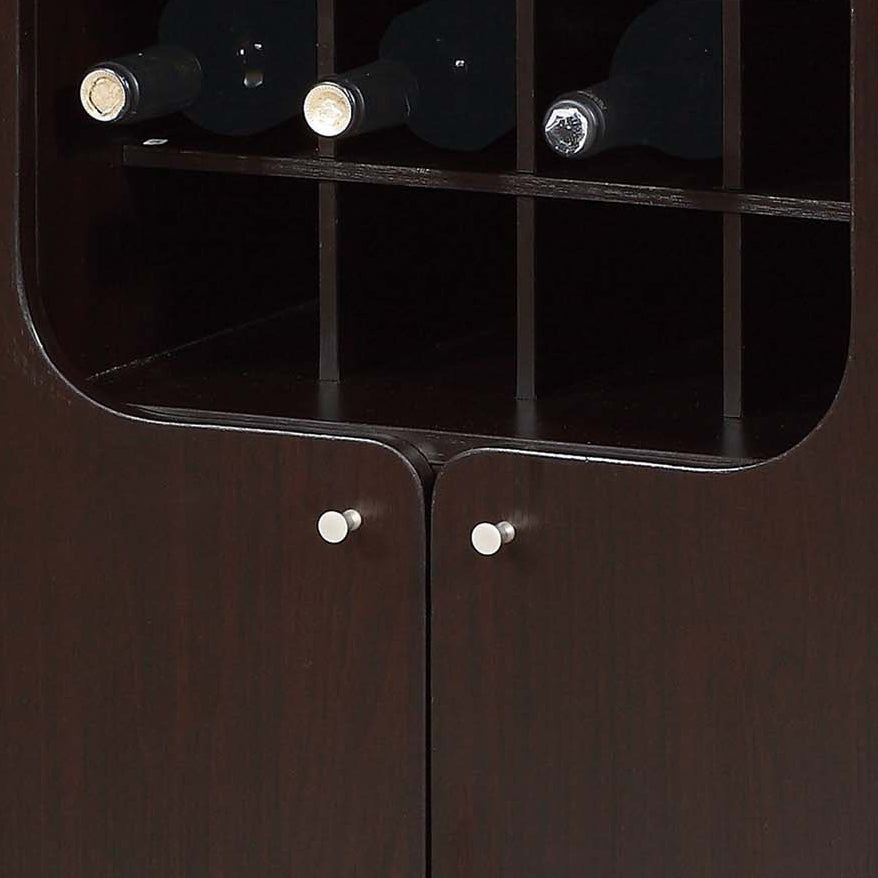 Display store and organize a bar cabinet nook in your space with this highly functional wine cabinet. Featuring curved cutout designs on two doors that swing smoothly on pin hinges, the wine bottle rack is removeable and holds up to twelve bottles. Two metal wine glass racks hold up to six wine glasses. Four shelf cubbies provide ample space to hold wine bar accessories and more bottles. Finished with two metal modern knob handles, use the top panel as a display surface as well.
