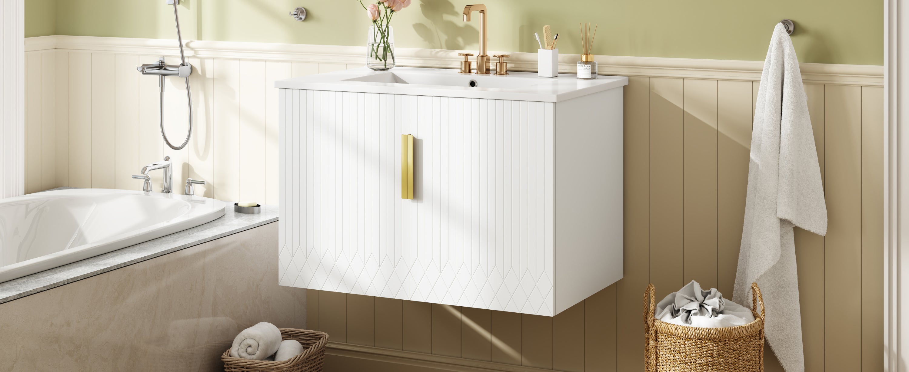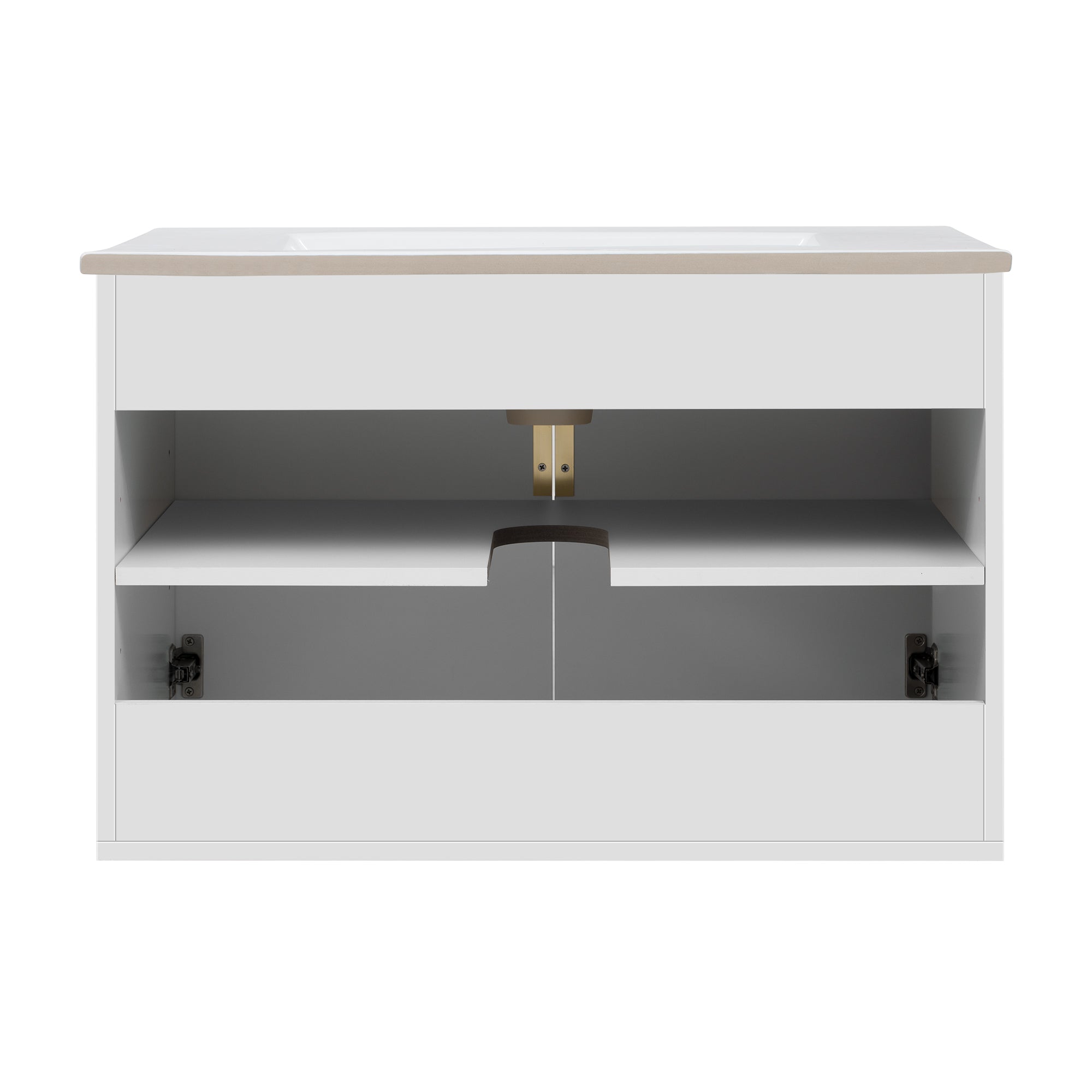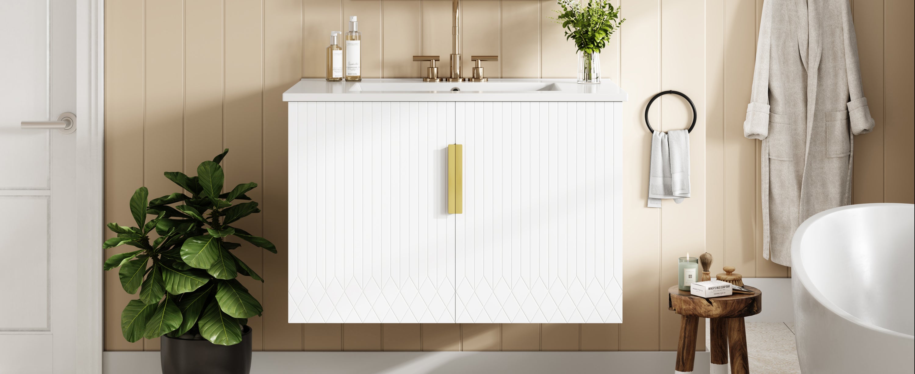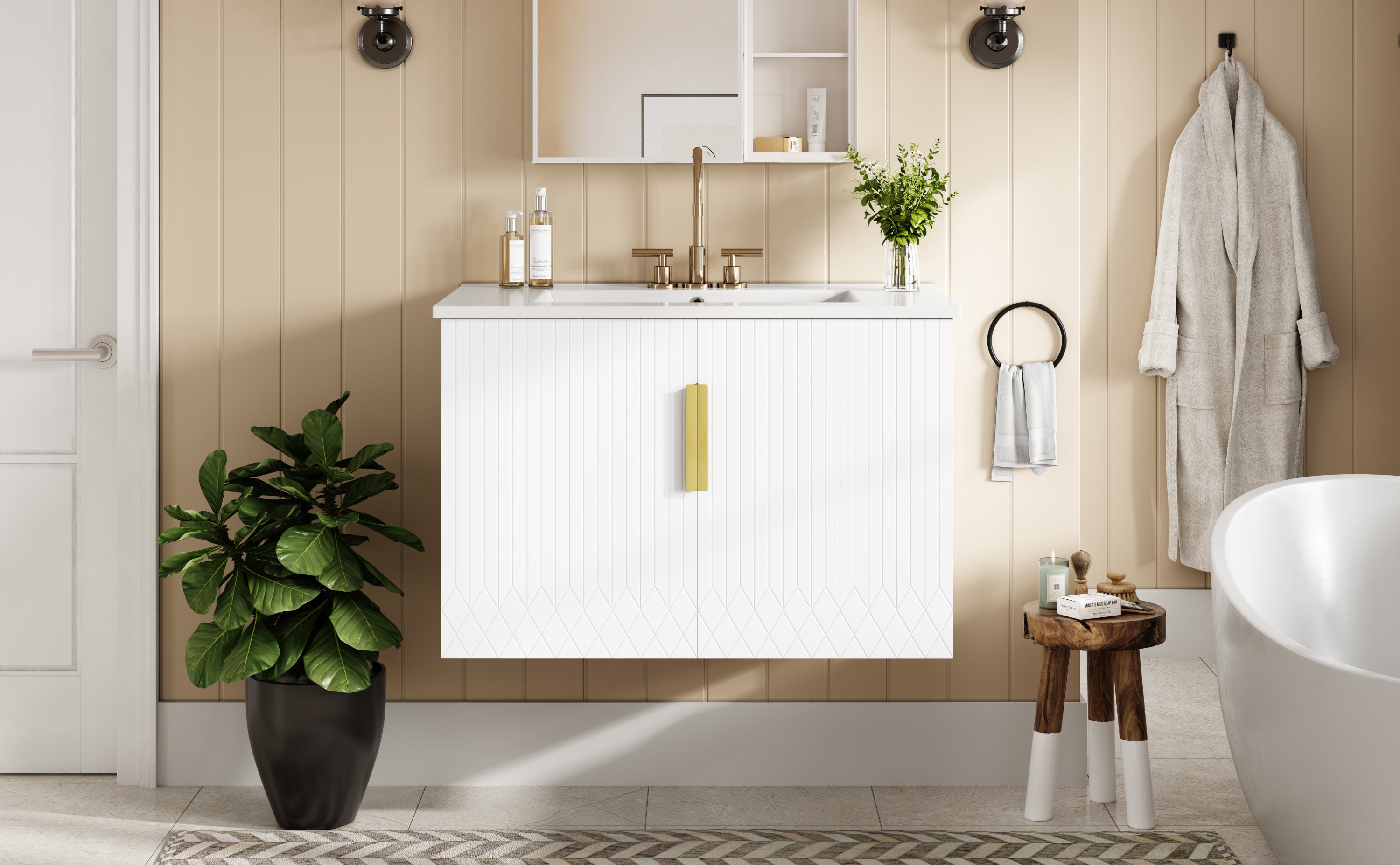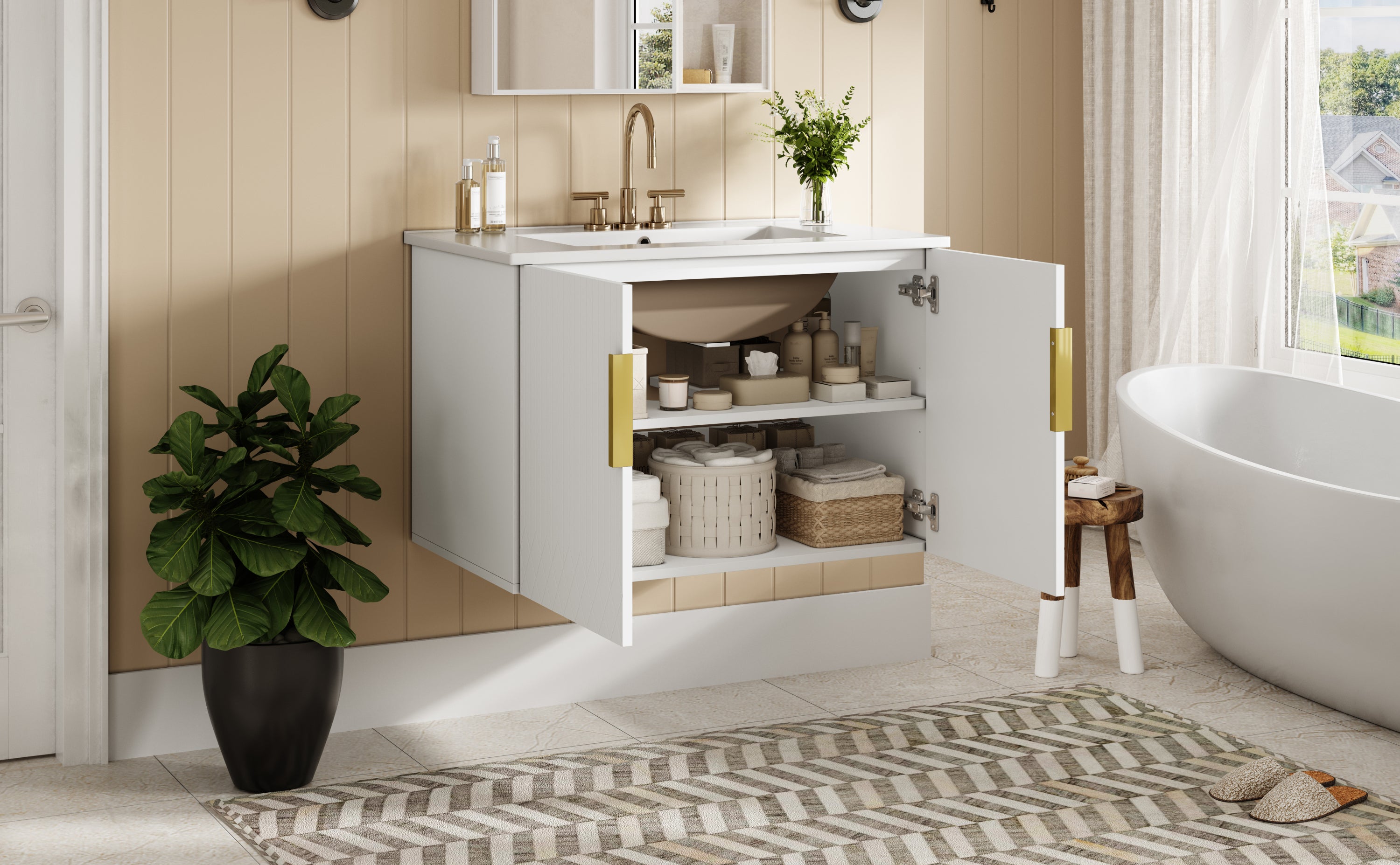 - Minimalist striped design with sleek hardware - Glossy white ceramic sink for a clean - Constructed from high-quality MDF and solid wood - Spacious storage with dual doors + adjustable shelf - Easy-to-clean, stain-resistant ceramic sink with overflow protection - High-end corrosion-resistant hardware