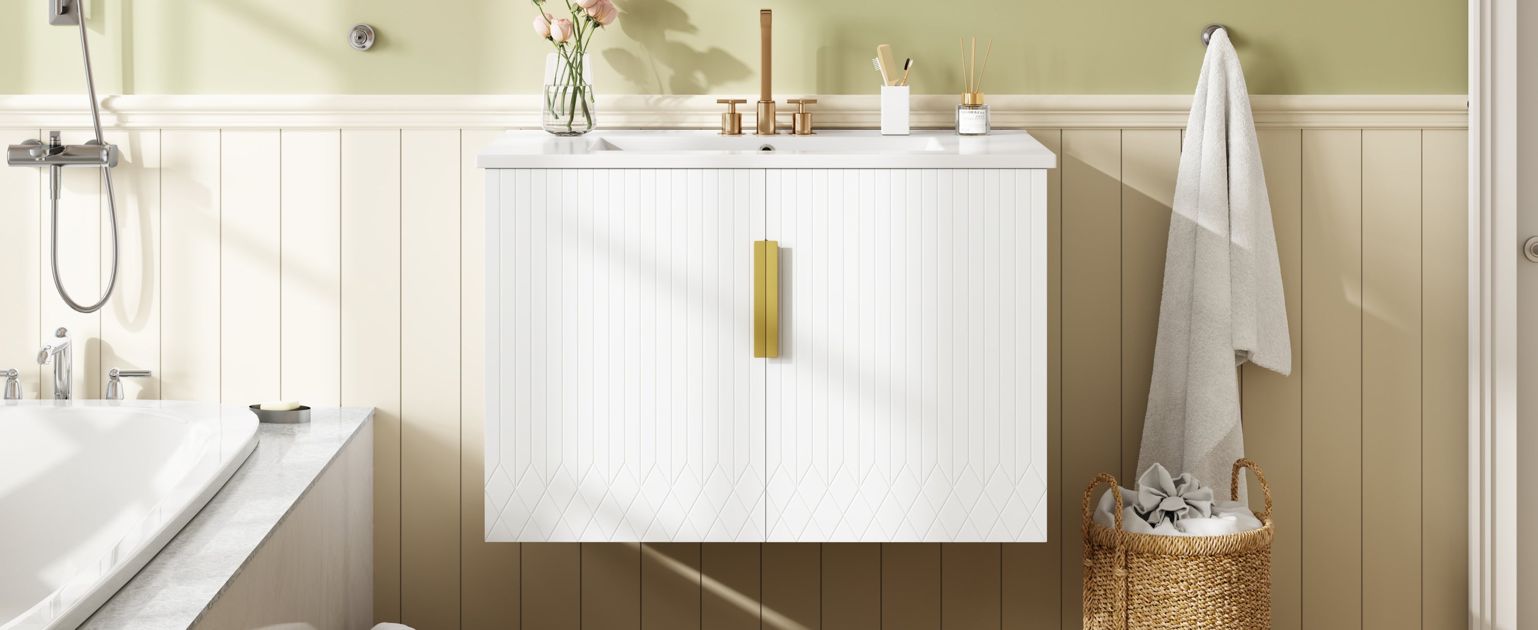 This vanity boasts a minimalist striped design with sleek, high-quality hardware, offering a contemporary aesthetic that elevates any bathroom. The glossy white ceramic sink enhances its upscale look, while the wall-mounted design ensures seamless integration into your space.