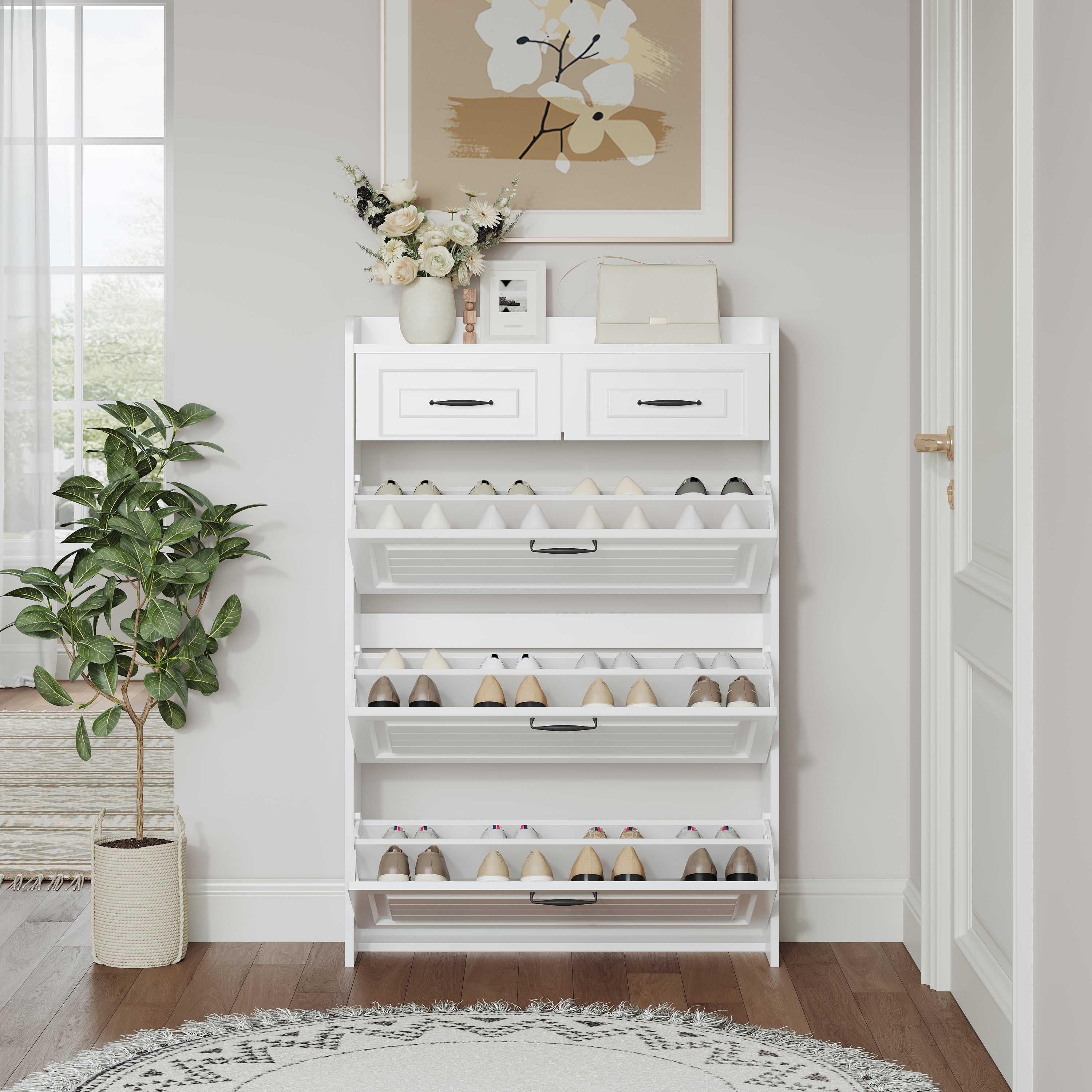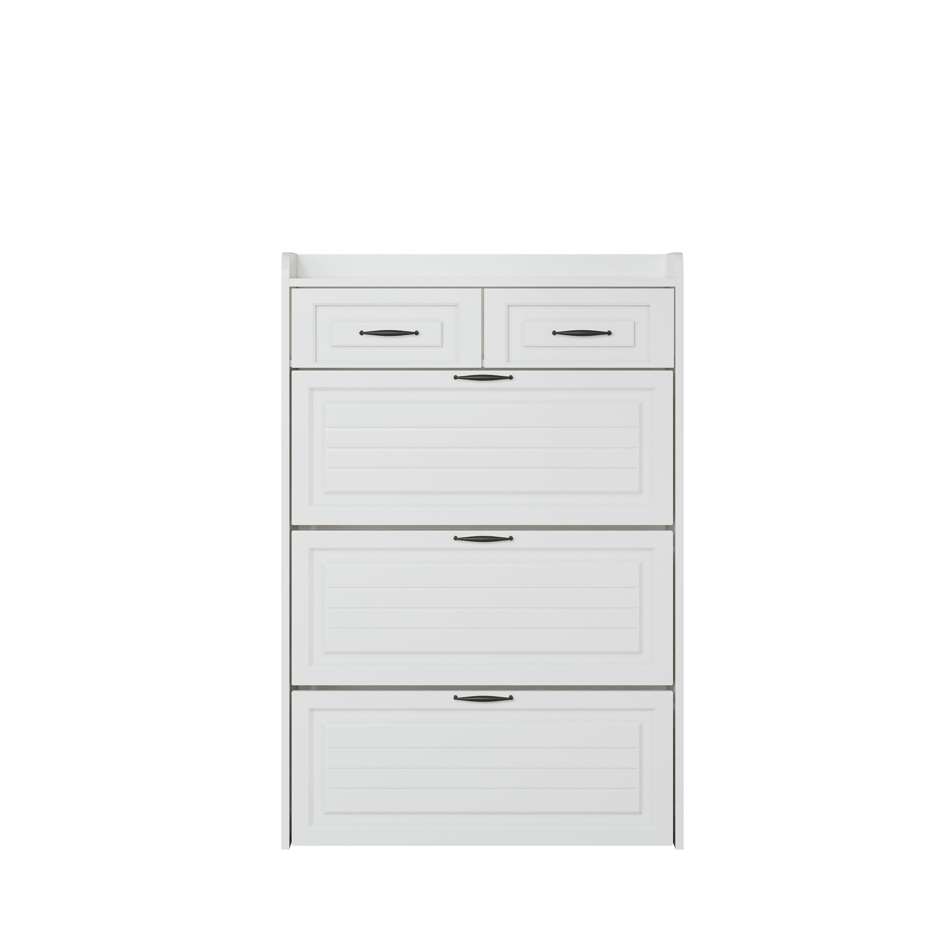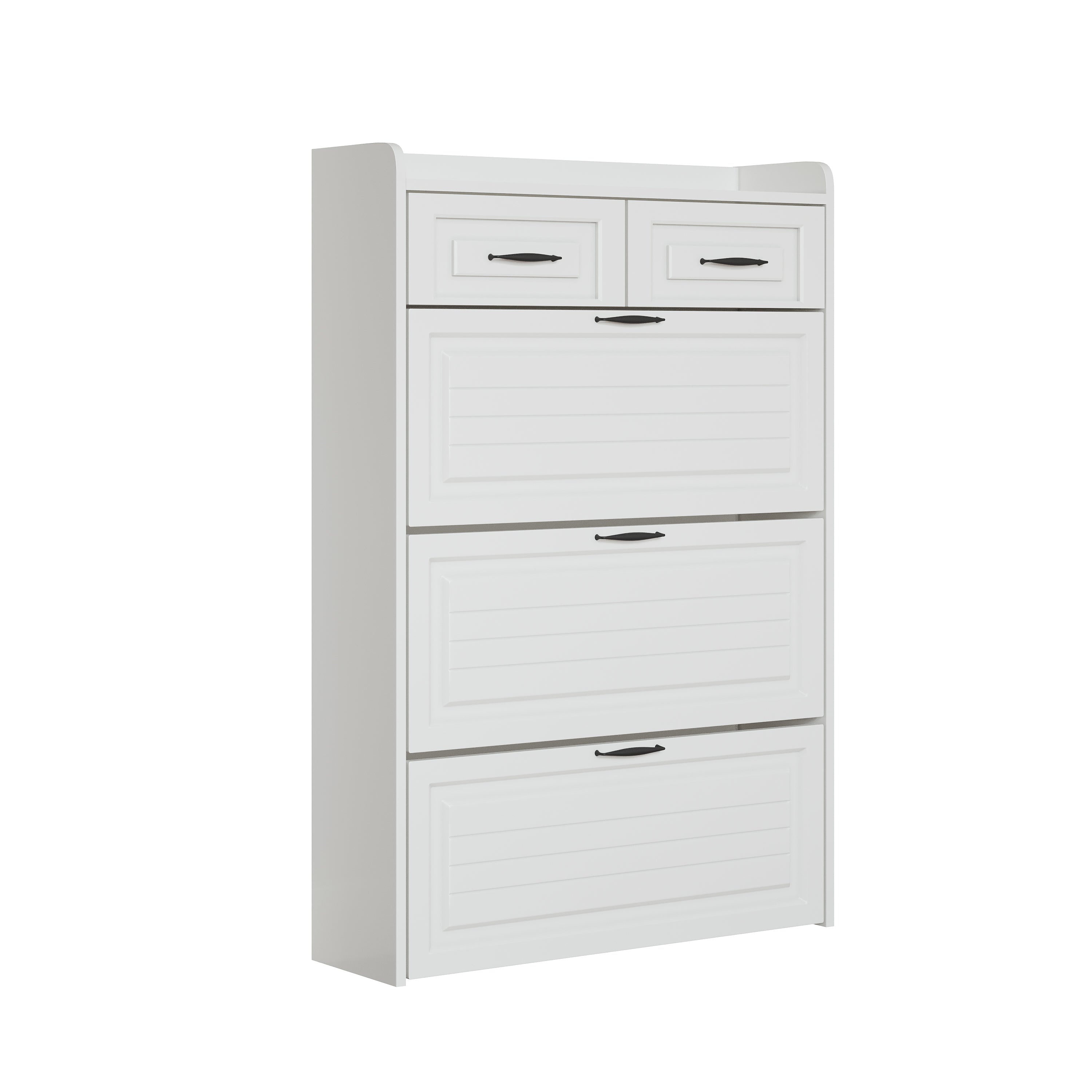 With 3 drop-down flap doors and 2 drawer storage. Perfect for keeping dust out! 3 flip-drawers of the shoe cabinet provide ample storage space for your shoes. The shoe cabinet is thin enough to fit even in a narrow hallway. Material: MDF in white finish. Item comes in a flat pack and requires self-assembly. Detailed instructions supplied.